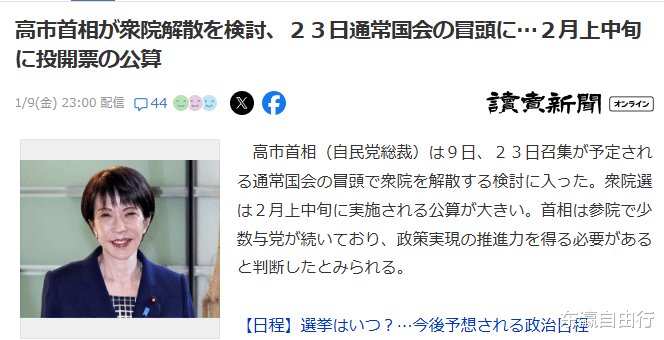 去年12月,高市首相指示亲信制定今年上半年可能的解散时间表。最快的选项是去年年底临时国会闭幕时解散,但考虑到对预算编制的影响而放弃,最终将目光集中到“通常国会开幕即解散”。