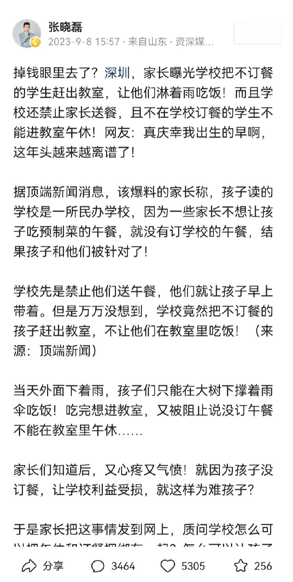 深圳,有家长曝光学校把不订餐的学生赶出教室,让他们淋着雨吃饭! 学校还禁止家长送餐,不在学校订餐的学生不能进教室午休! 这是真实的吗? 希望是谣言,不然真的心冷了! 不想吃不吃还不行吗? 至少可以多种选择啊,愿不愿意订餐全凭自愿。 再说了,学校不该反思吗?如果订餐让家长和学生都满意,谁会愿意送餐到校门口,不用上班吗?不用挣钱养家吗?
