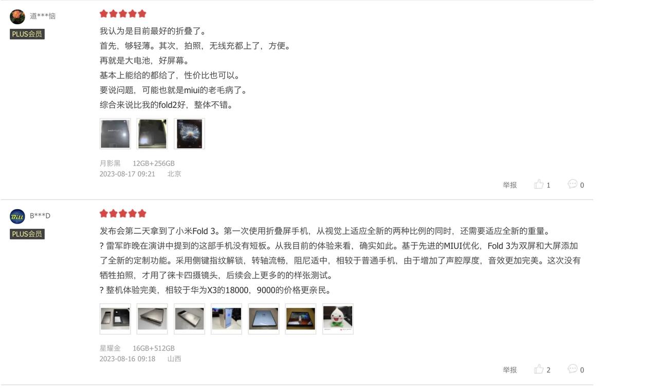 感觉大家似乎都小看这款折叠屏了,耐摔和影像只不过是其中的两个优势而已,轻薄+全能确实做到了 最近大家可能把关注点都放在了华为mate60系列和iPhone 15系列的身上了,似乎已经忘记了一个月前发布的小米MIX Fold3折叠屏了。我也是将其打开看了一眼,还是有些惊喜的,99%的好评,以前只觉得小米MIX Fold3优势是影像部分和更加耐摔了,结果看了评价才知道我对这款手机了解的还是不够。 影像大家都清楚,徕卡光学全焦段四摄,也是目前折叠屏手机中唯一的四摄,大家对这款手机的影像确实赞不绝口。因为龙骨转轴的存在,小米 MIX Fold3相当耐摔,是目前折叠屏手机中最耐摔的一个,有效避免了折叠屏的缺陷。 但我发现更多人对这款手机的续航也相当满意,其实早在刚刚发布的时候就有测试表明,小米MIX Fold3是折叠屏中续航能力最强的。还有就是轻薄+全能这点,不少折叠屏因为偏向轻薄,所以在配置上或多或少都有阉割,但是MIX Fold3确实拉满了,顶级旗舰机的水准。 或许大家也不一定只盯着最近这两款手机看,小米MIX Fold3同样值得#寻找数码点评派#