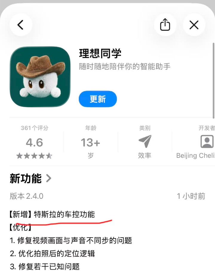 2026年4月14日,iOS版理想同学App迎2.4.0版更新,理想AI眼镜Livis新增支持特斯拉车控功能。