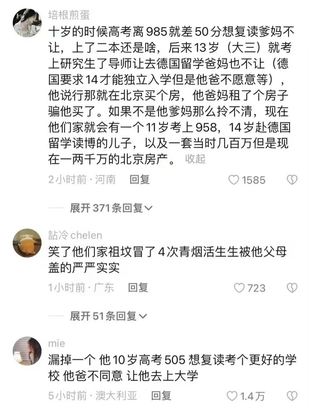 所谓的神童, 我只看到了他的自私,还不如承欢膝下可以养活自己的普通孩子。 高不成低不就,受名声所累,不能踏实工作,工地搬砖也能养活自己,何苦受累双亲,这么大了还要父母打钱,这就是所谓的回报吗? 就算父母在他成长过程中左右了他的选择,但是真正的天才从不在意环境,父母已经给了他生命。如果说连续四次他被父母改变了生活的轨迹,那么他自己有没有努力去改变自己的命运 ? 天才不光会做题,最重要的是情商,连续4次,那就是自己也有问题。