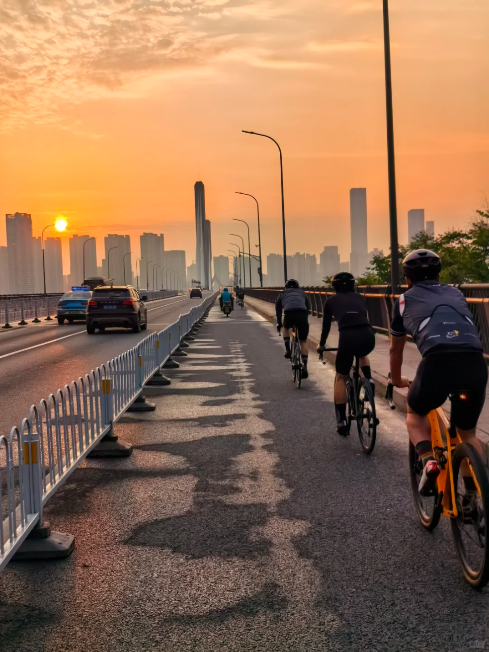 秋日的湘江边,江风带着湿润的气息,吹散所有烦躁。骑行时能看到橘子洲头的轮廓在远处若隐若现,江面上偶尔有货轮缓缓驶过,留下一道道水痕。“上周我们骑到中途,还在江边的观景台坐了会儿,看着夕阳把江水染成金色,那种感觉太治愈了!”周大叔说。