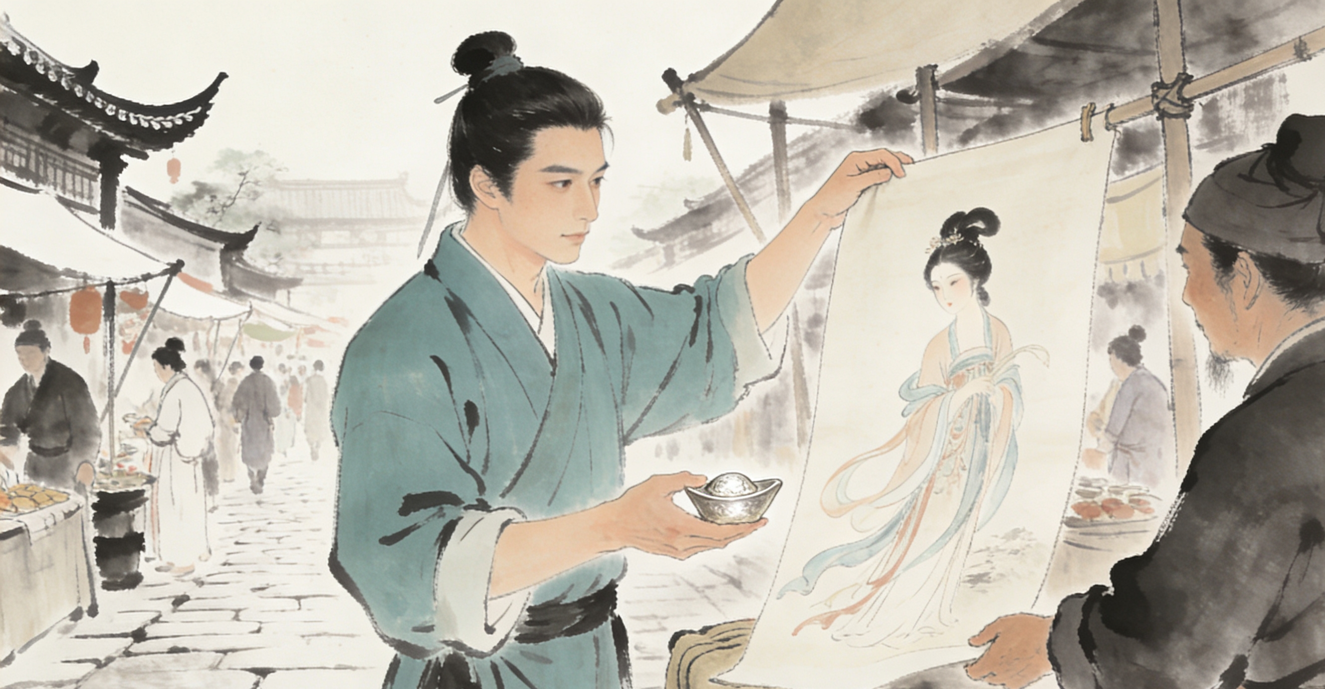 忽然,一幅美人图映入眼帘,画中女子身着淡紫色长裙,青丝如瀑,双眸含情,似要从画中走出一般。秦逸瞬间被吸引,觉得此女乃世间罕有之色,当下便掏出身上所有银钱,将画买下。