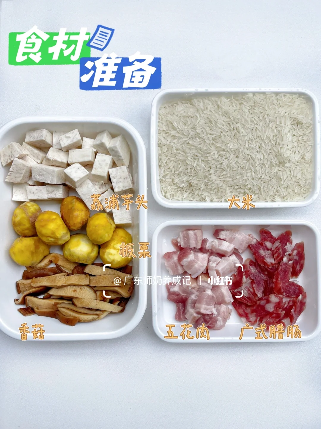 🌰【食材】:大米,芋头,板栗,五花肉,腊肠,香菇,葱花(材料可按个人喜好增减哈~)
