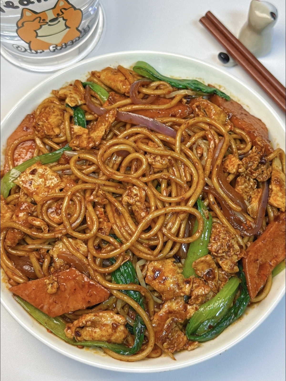 答应我!一定要试试这个路边摊炒面!面条裹满了香辣的酱汁,口感劲道~鸡蛋和火腿煎得焦香入味,真的巨好吃!简简单单,好吃到可