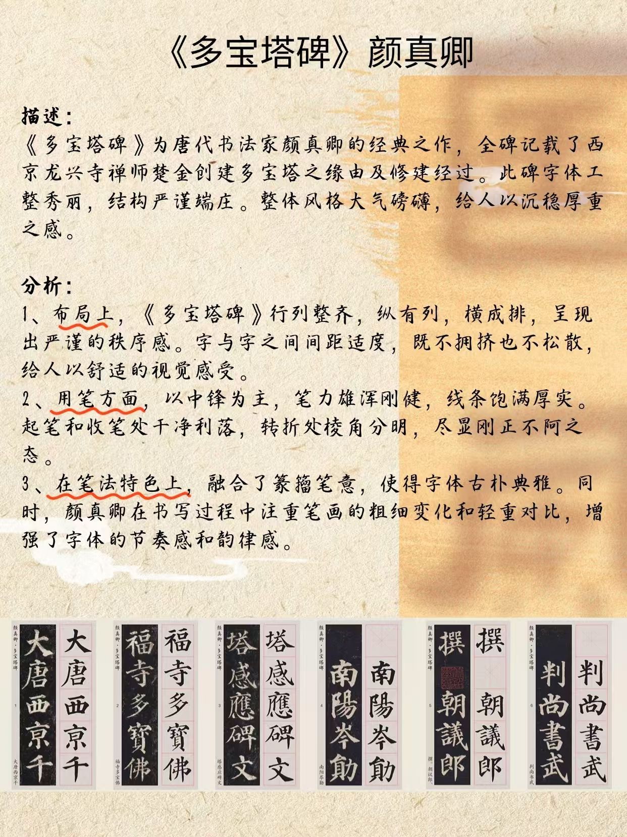 在布局、用笔、笔法上极具特色,《多宝塔碑》被后世广为推崇,被誉为楷书的经典范本之一。它对后世书法的发展产生了深远的影响,许多书法家从中学到了严谨的结构和刚健的笔法。