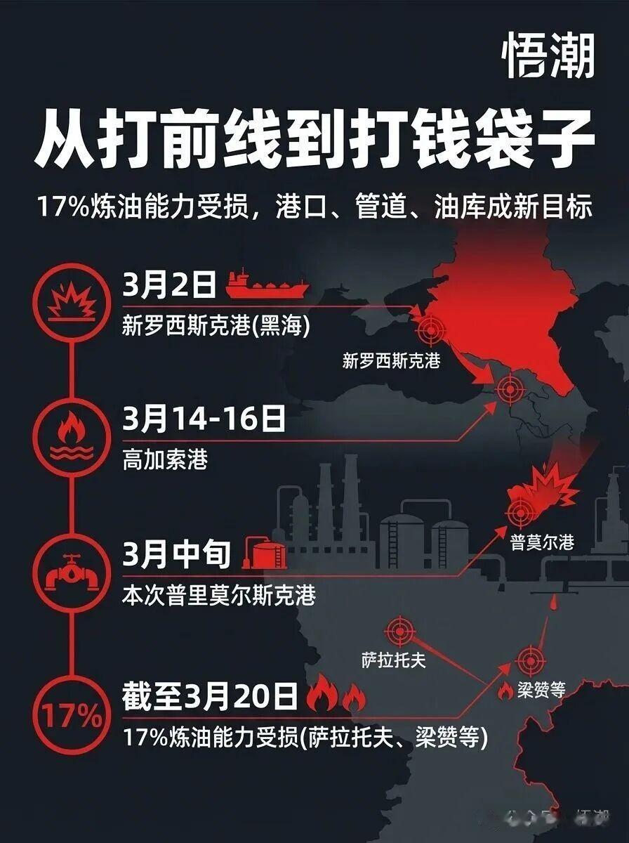 冲突初期,乌方主要攻击前线军用机场与弹药库,如今却越来越多地瞄准俄罗斯后方能源设施。特别是中东战事爆发后,乌方对俄石油港口袭击愈发频繁。