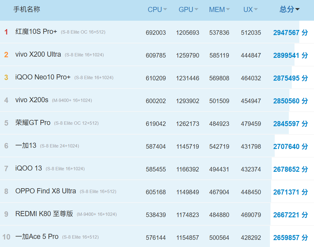 一个有趣的现象是,榜单前列几乎被骁龙8至尊版“包场”,可以看出在高端旗舰领域,高通依然是那个难以撼动的“霸主”。