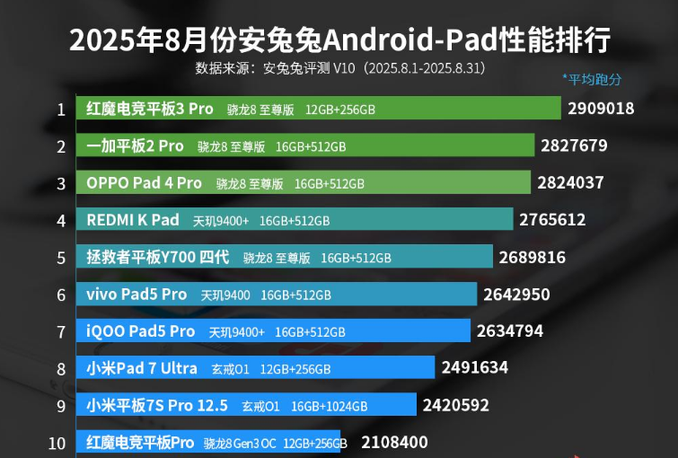视线转向安卓平板性能榜,我们再次看到了“熟悉的配方”。红魔电竞平板3 Pro、一加平板2 Pro、OPPO Pad 4 Pro,清一色地搭载了骁龙8至尊版处理器。这颗旗舰芯片不仅在手机上大放异彩,在尺寸更大、散热空间更足的平板上,更是如鱼得水,为用户带来了无与伦比的影音和游戏体验。