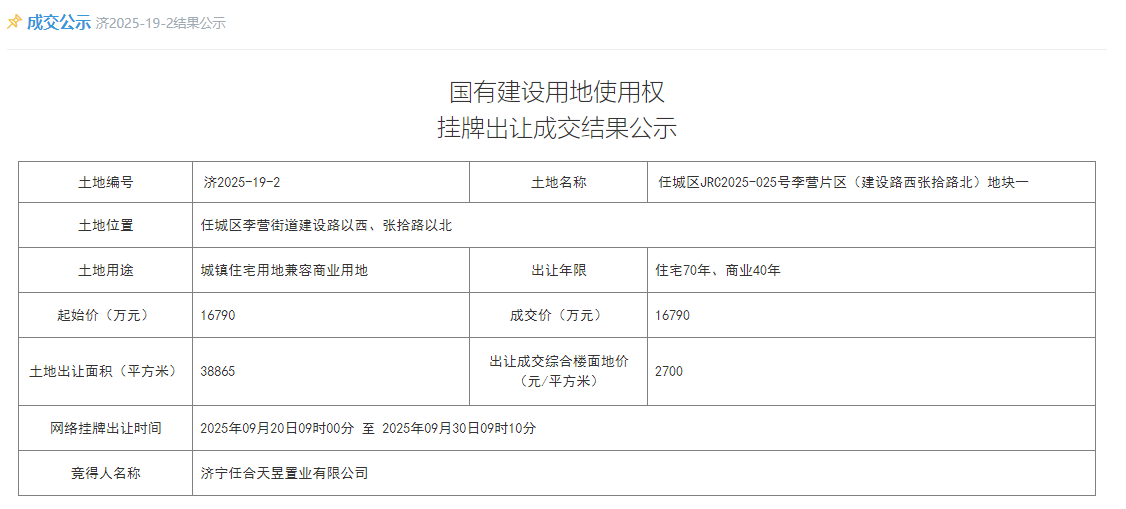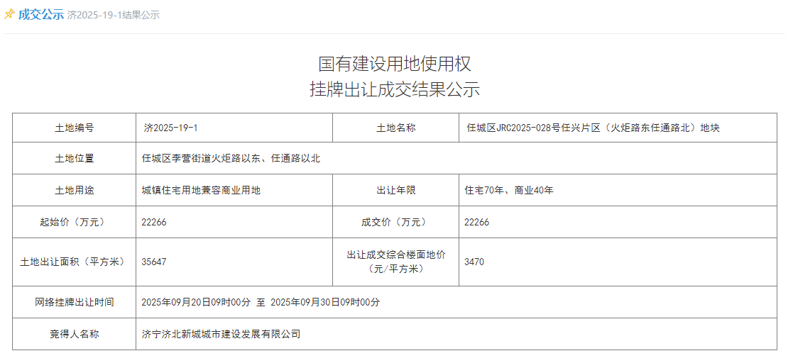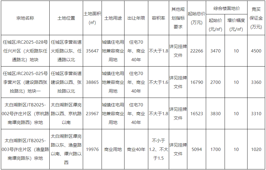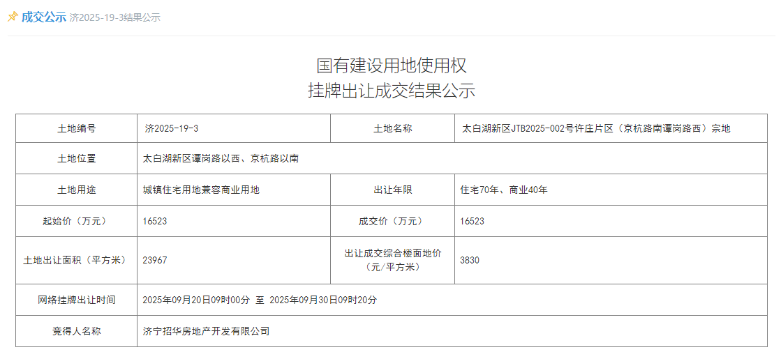 经济宁市人民政府批准,济宁市自然资源和规划局宣布将以网上挂牌方式,推出4宗位于任城区、太白湖新区的国有建设用地使用权,根据出让数据了解,土地用途为3宗商住用地、1宗商业用地;土地总面积为118455㎡(约178亩);总起始价为60673万元。经竞价后,4宗地块均底价成交,最终成交价为60673万元。