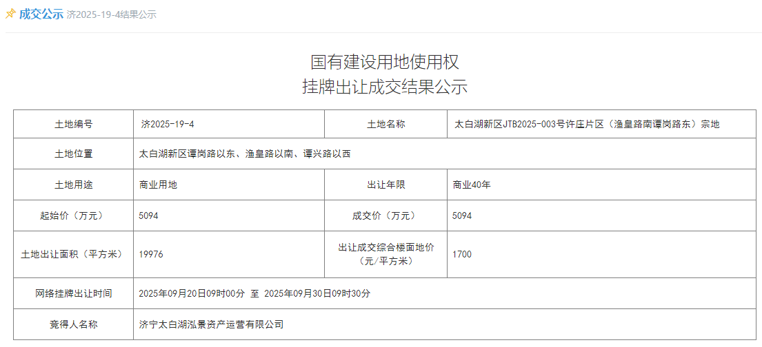 竞得企业:济宁太白湖泓景资产运营有限公司