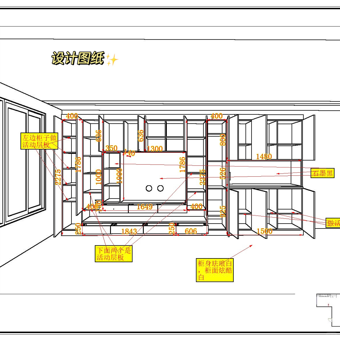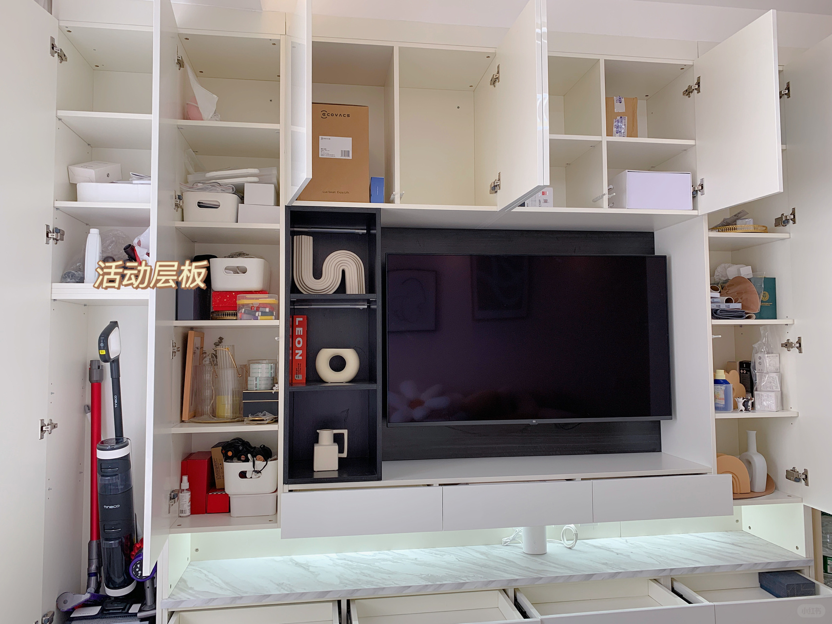 1. 通过图纸也可以看到最左侧和电视柜最右侧两列柜子我做了活动层板,便于灵活储物,需要放置吸尘器等大物件时直接移动活动层板即可