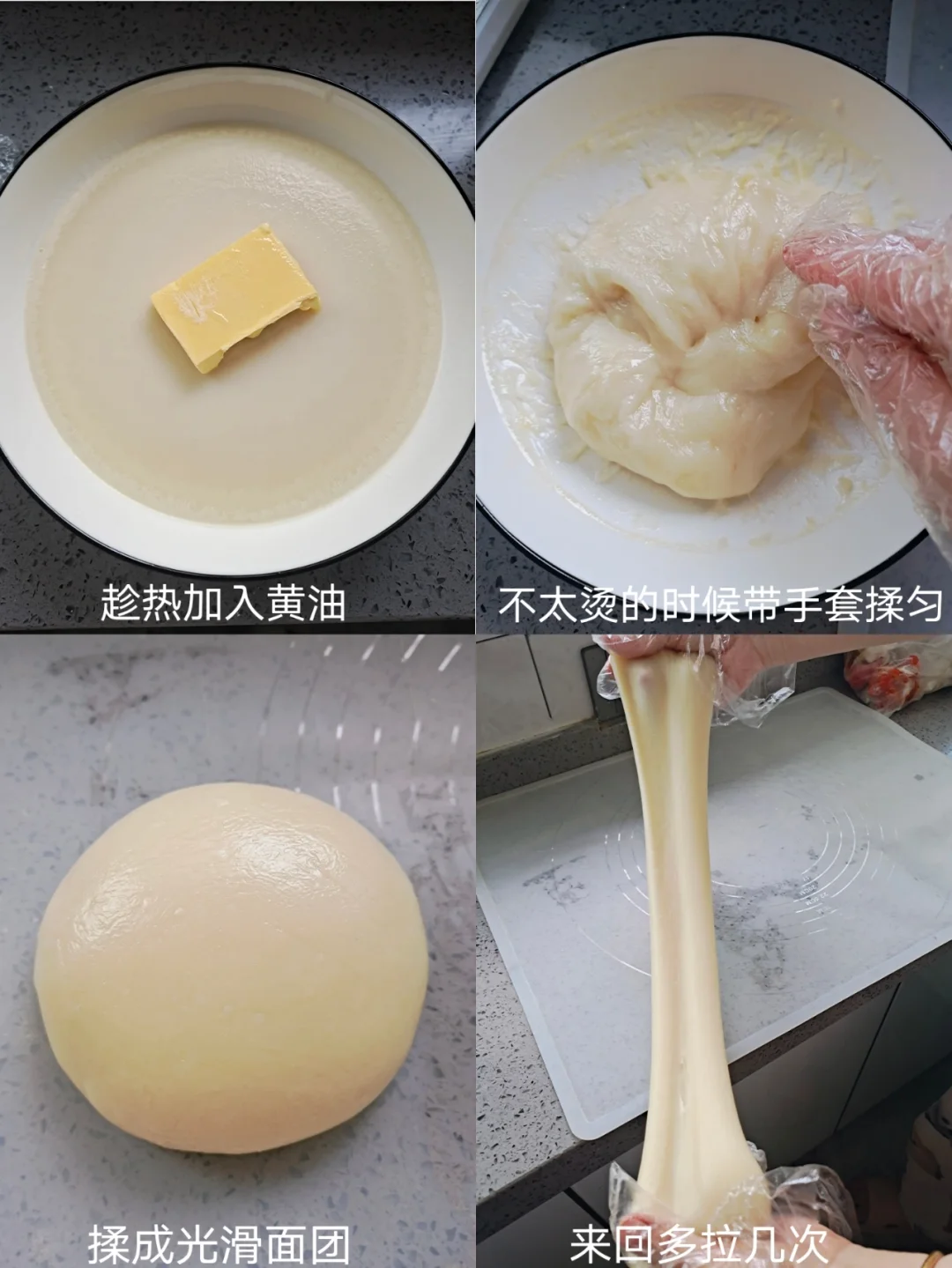 [二R]蒸熟后,趁热加入黄油,稍微不烫手的时候戴一次性手套揉到光滑(不戴手套会很黏),尽量热一点的时候就揉面,如图来回可以多拉几次。