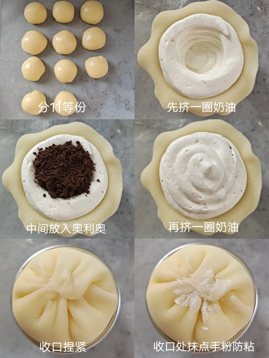 [四R]将揉好的面团分成11个剂子,撒熟粉防粘,擀成中间厚两边薄的面皮,面皮放入模具内,先挤一层奶油,加入奥利奥碎,再挤一层奶油,提起四周收口收紧,收口处沾点手粉防粘,放入冰箱冷藏定型1小时,就ok啦!!试试吧,真的超级好吃。