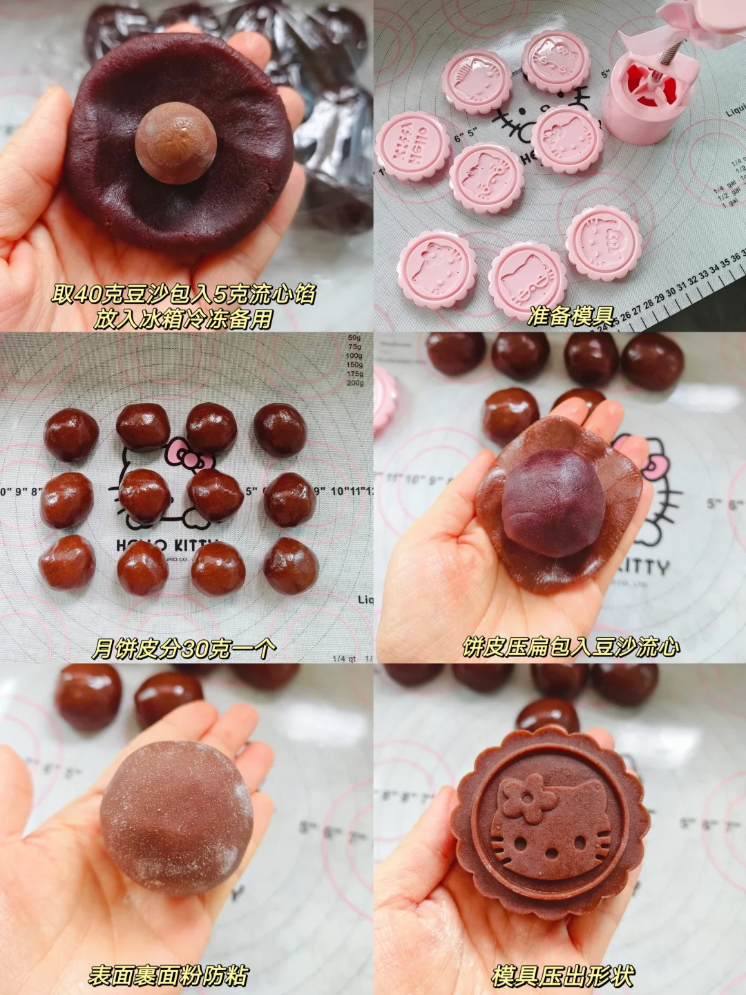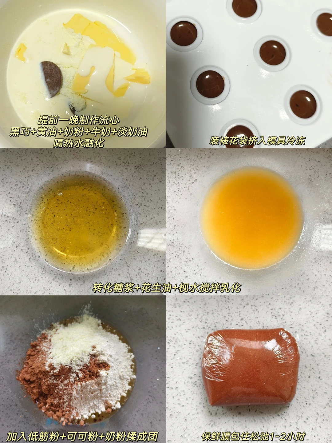 [一R]提前一晚制作流心馅,将流心馅的所有材料混合,隔热水融化,装入裱花袋挤入模具,冷冻一夜[二R]月饼糖浆+枧水+花生油搅拌均匀,加入低筋粉、可可粉、奶粉揉至无干粉,包保鲜膜室温醒面1-2小时。