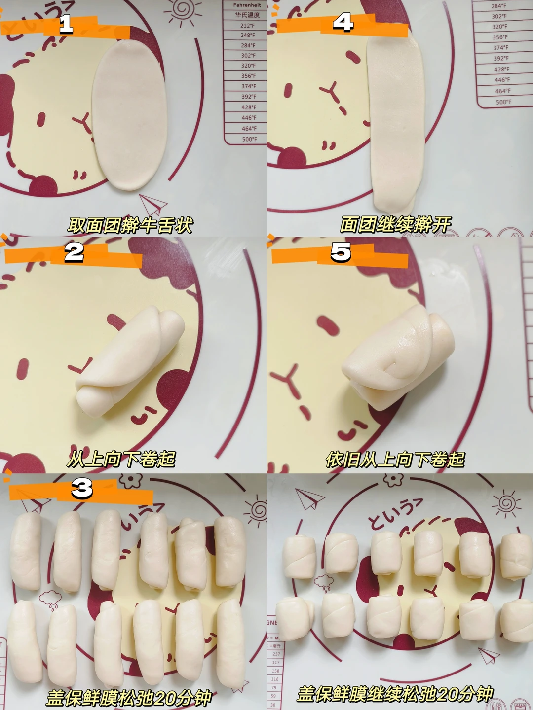 [六R]包好的面团用擀面杖擀椭圆形,从下往上卷起,全部做好后,盖保鲜膜静置松弛20分钟以上。(松弛的时间一定要够)