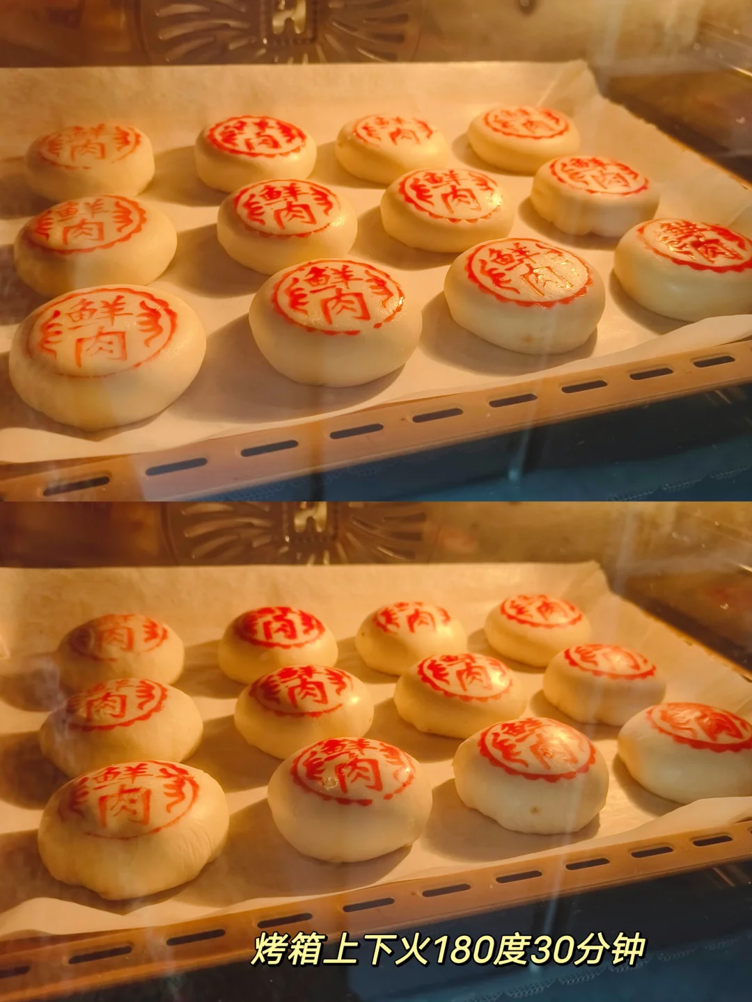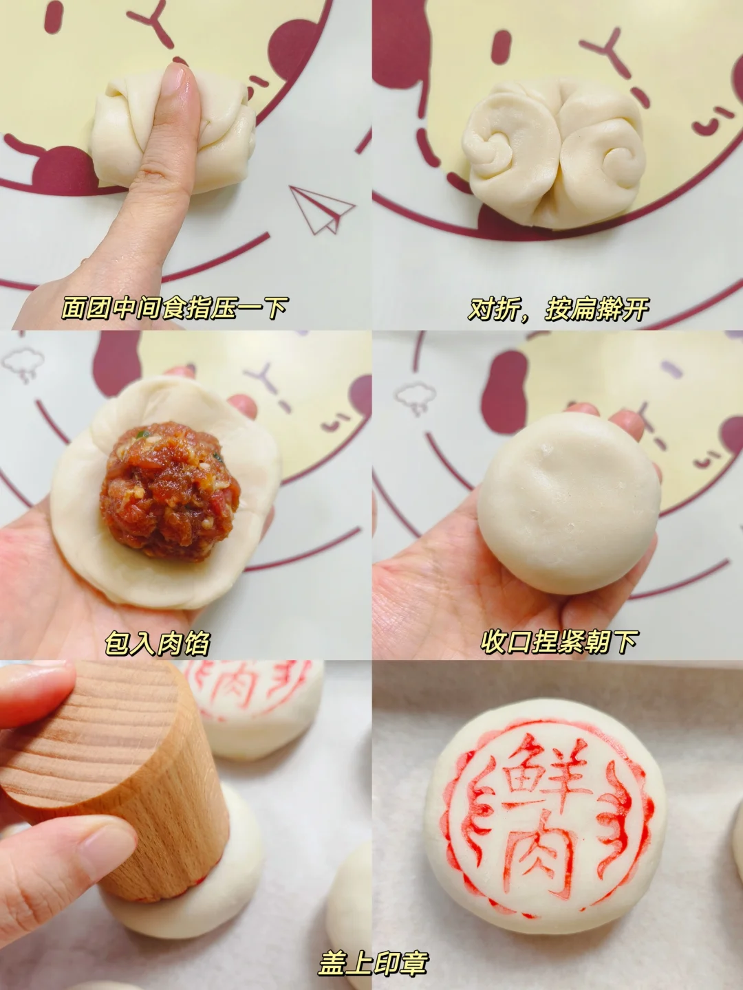 [八R]取一个松弛好的面卷,按压面卷中间,让面卷对折,压扁擀成圆形,包入馅料,翻过来收口朝下,双手搓动生胚整圆,稍微按压一下,放入烤盘,盖上印章(自己吃有没有印章无所谓啦,好吃就行),烤箱180预热,烤30分钟出炉啦~