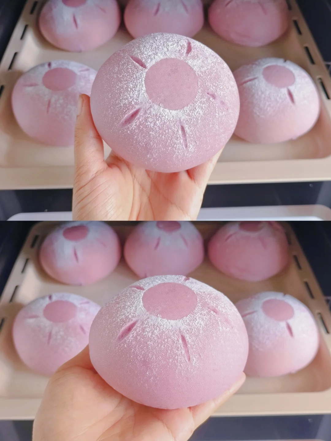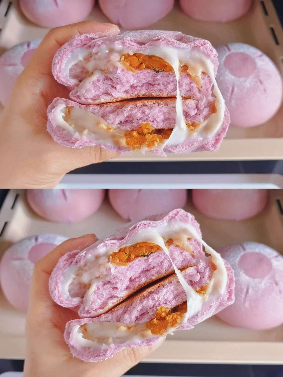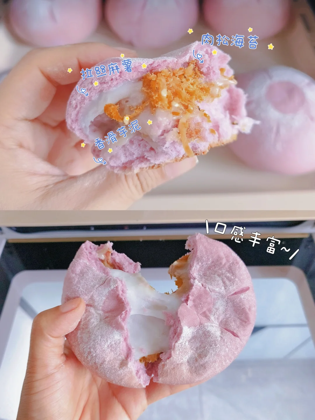 造型可爱胖嘟嘟,面包体又是很柔软的,再配上芋泥麻薯肉松,一口下去超级满足,口感超级丰富~