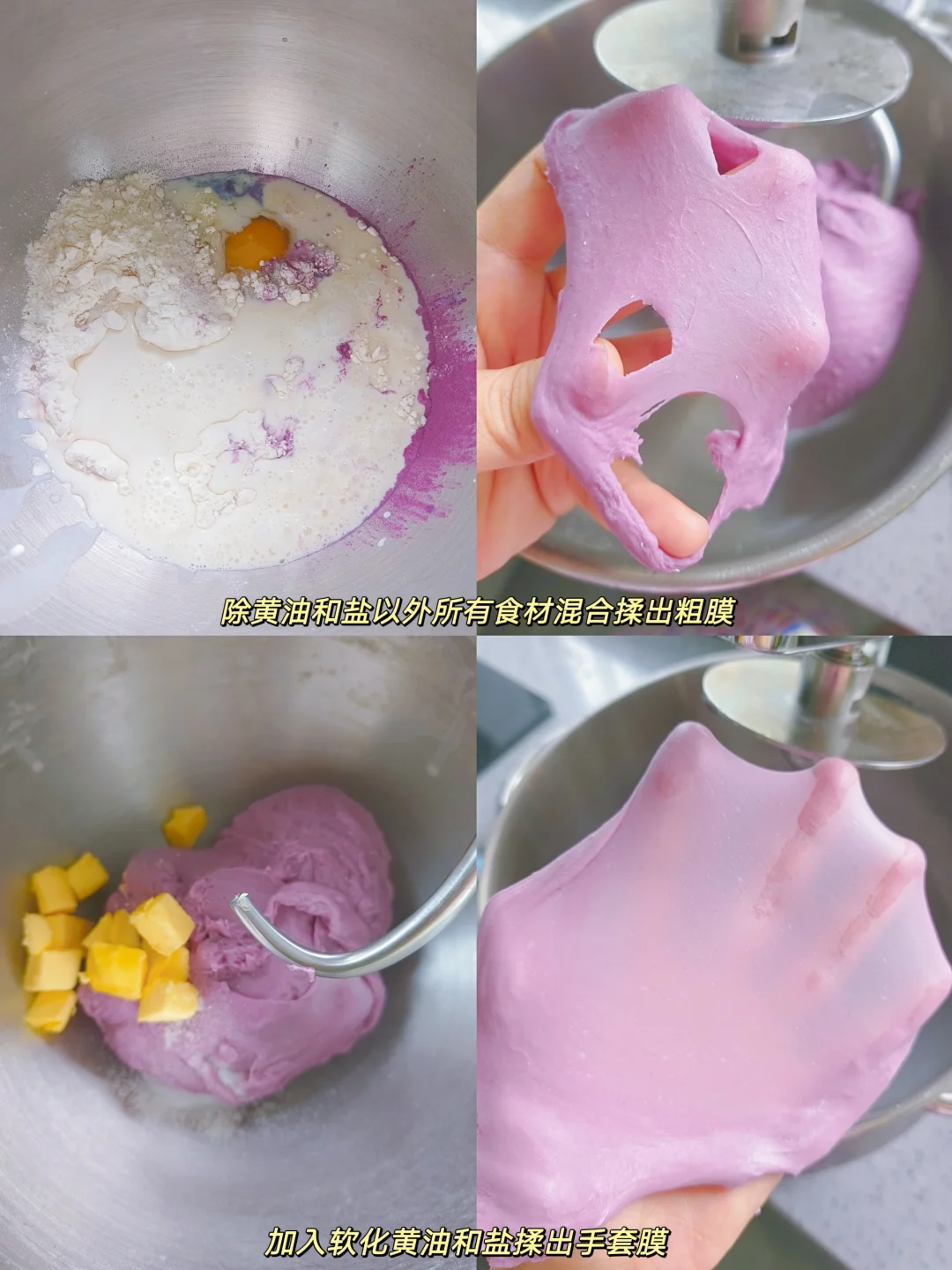 [彩虹R]面包体:高筋粉250克,蛋液45克,紫薯粉10克,耐高糖酵母3克,糖30克,冰牛奶125克(牛奶预留10克,慢慢加),盐2克,黄油20克