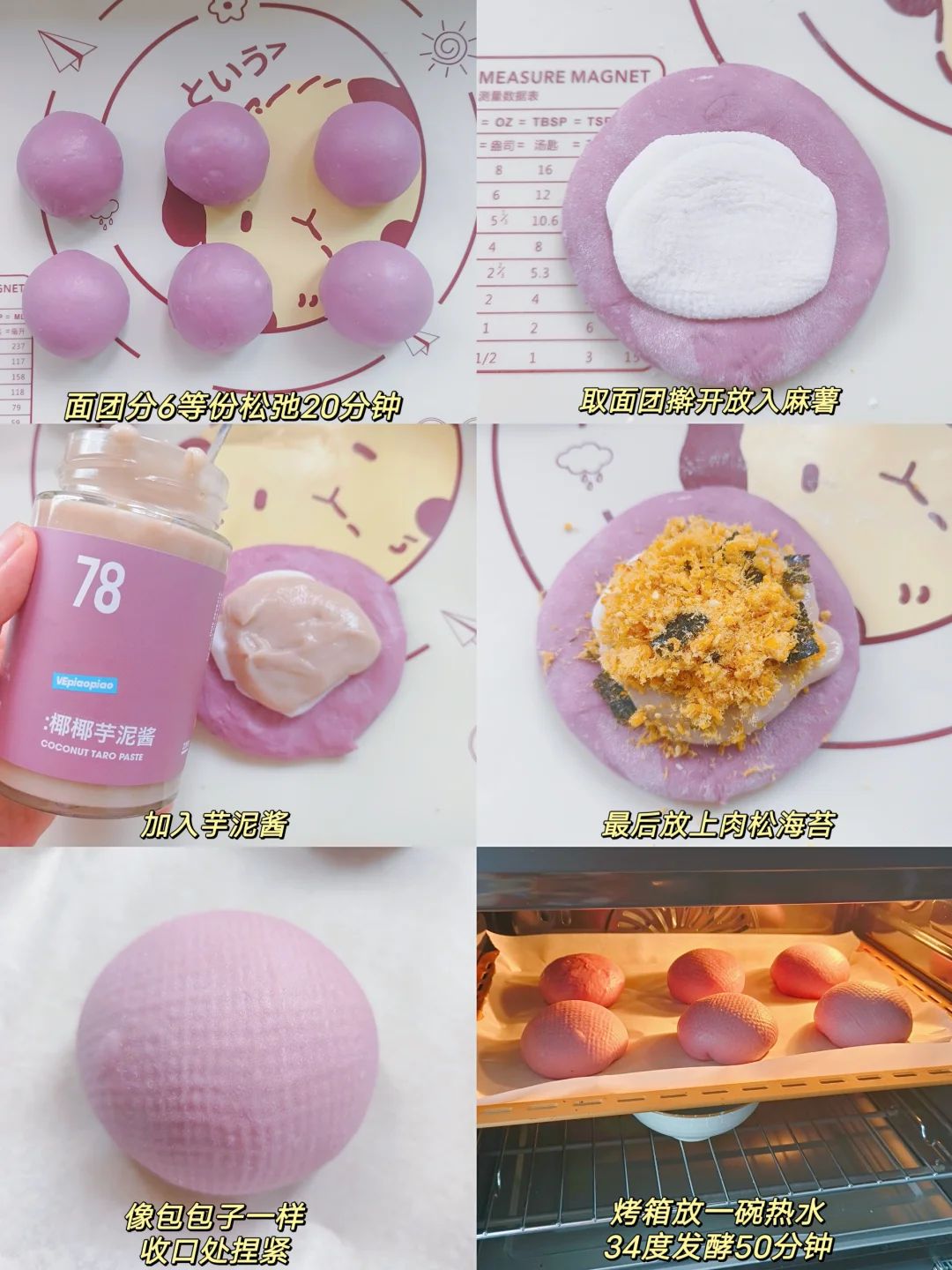 [三R]取面团擀开,先铺麻薯,再放芋泥,最后放海苔肉松,像包包子一样,收口处捏紧朝下放入烤盘,烤箱34度50分钟发酵1.5倍大(烤箱里面放一碗热水)