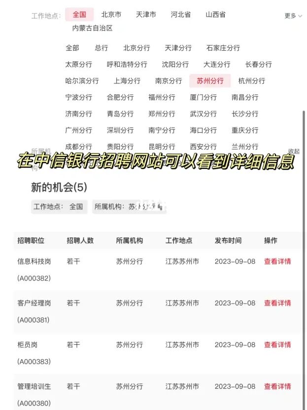 具体岗位要求可以详见中信银行招聘网站“校园招聘”栏目下的所属机构“苏州分行”或者工作地点:苏州,进行校园招聘在线网申。