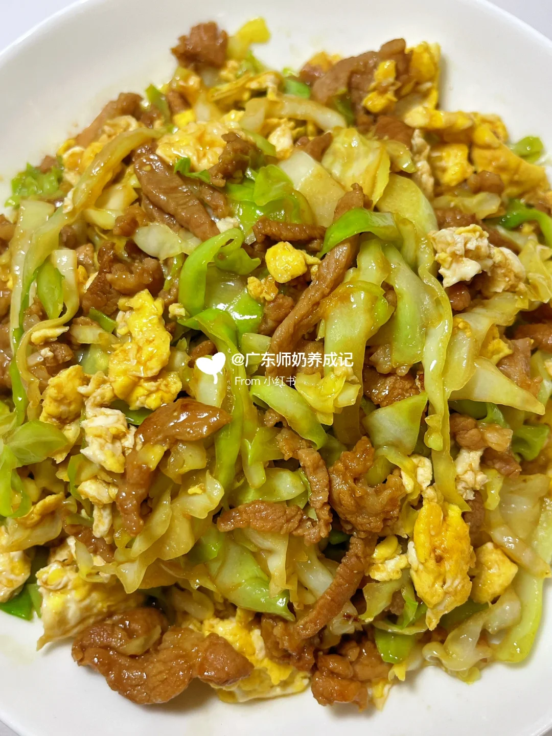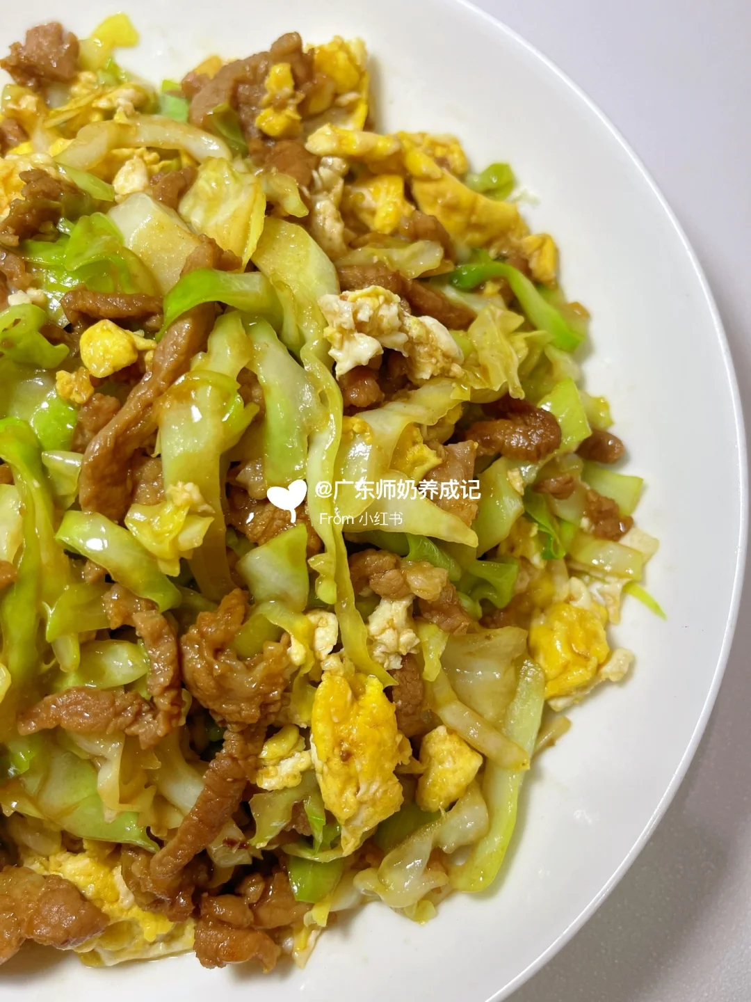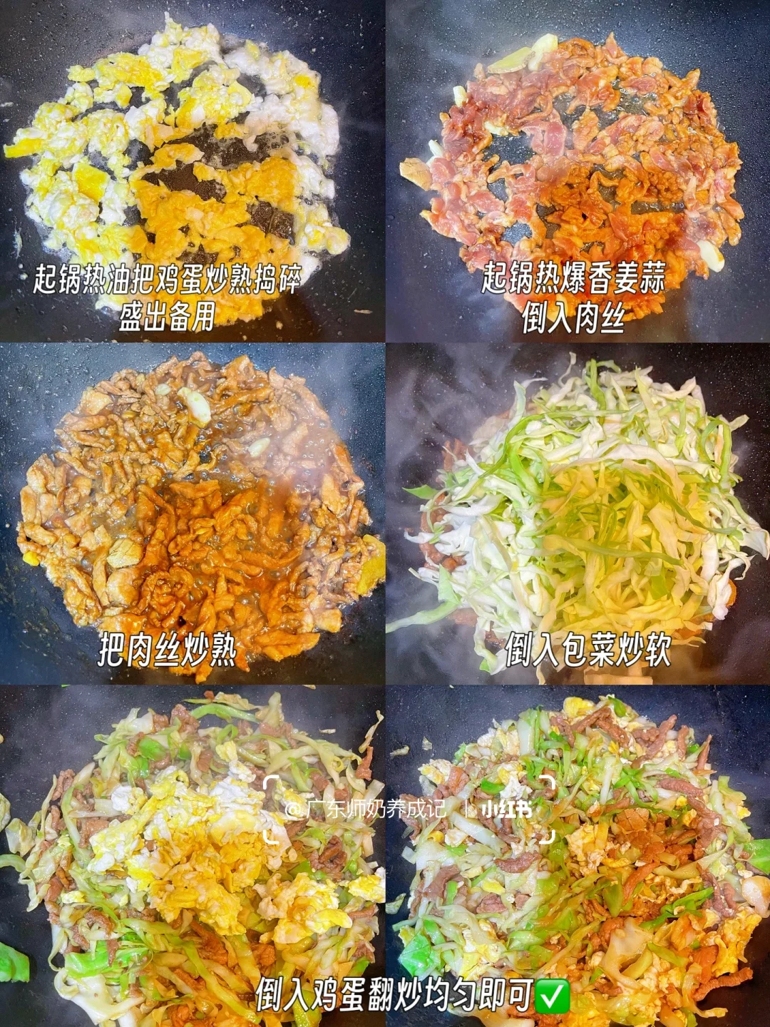 3⃣️起锅热油爆香姜蒜,倒入肉丝炒熟,加入包菜炒软,再倒入鸡蛋翻炒均匀即可✅