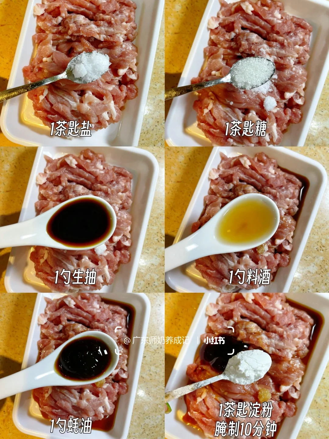 1⃣️包菜切丝,猪肉切丝,参考图片腌制