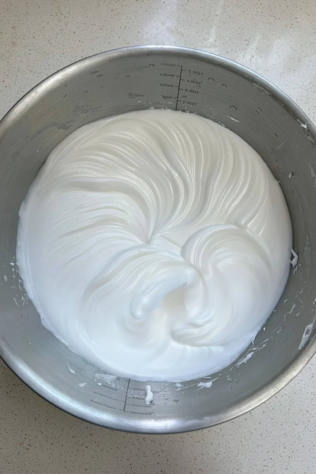 蛋白打发很关键,一开始先低速将蛋白打散,然后打蛋器开高速打发,最后低速整理,一定不要着急要慢慢的整理蛋白,除了多练习,没有任何捷径。蛋白霜对于蛋糕来说非常重要,蛋白霜状态掌握不好,做出来的蛋糕卷就会出现塌陷,布丁层等原因。
