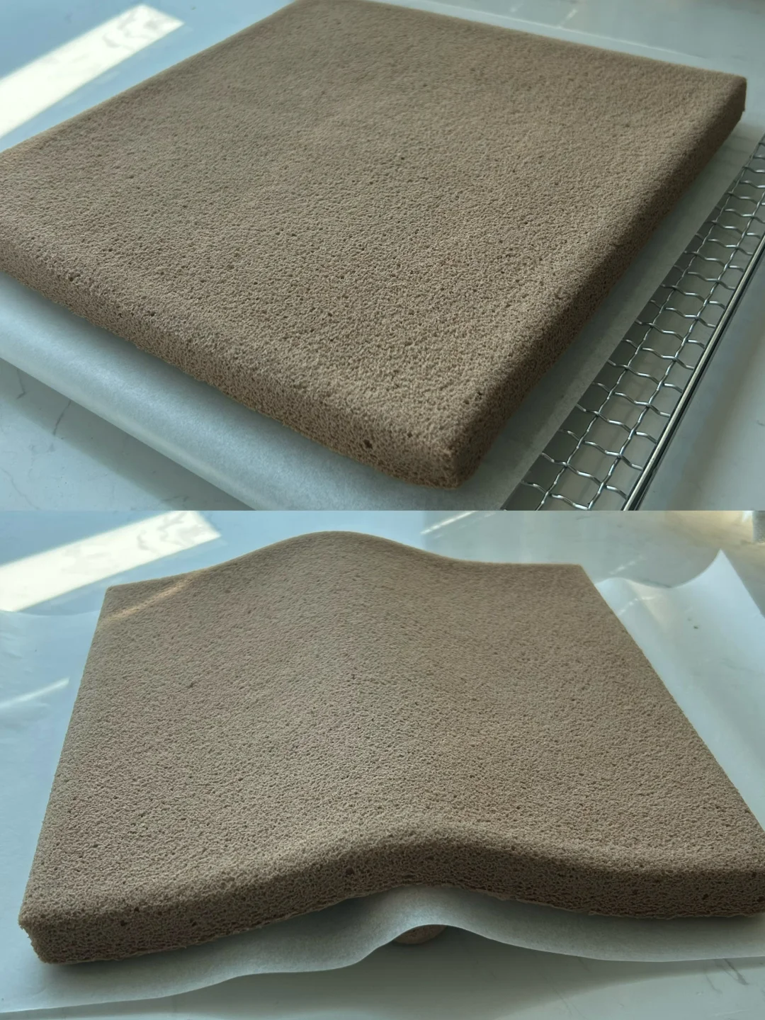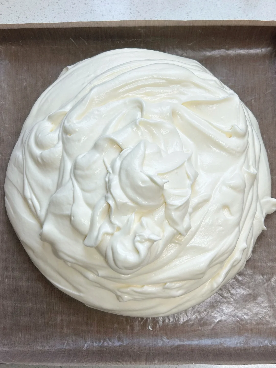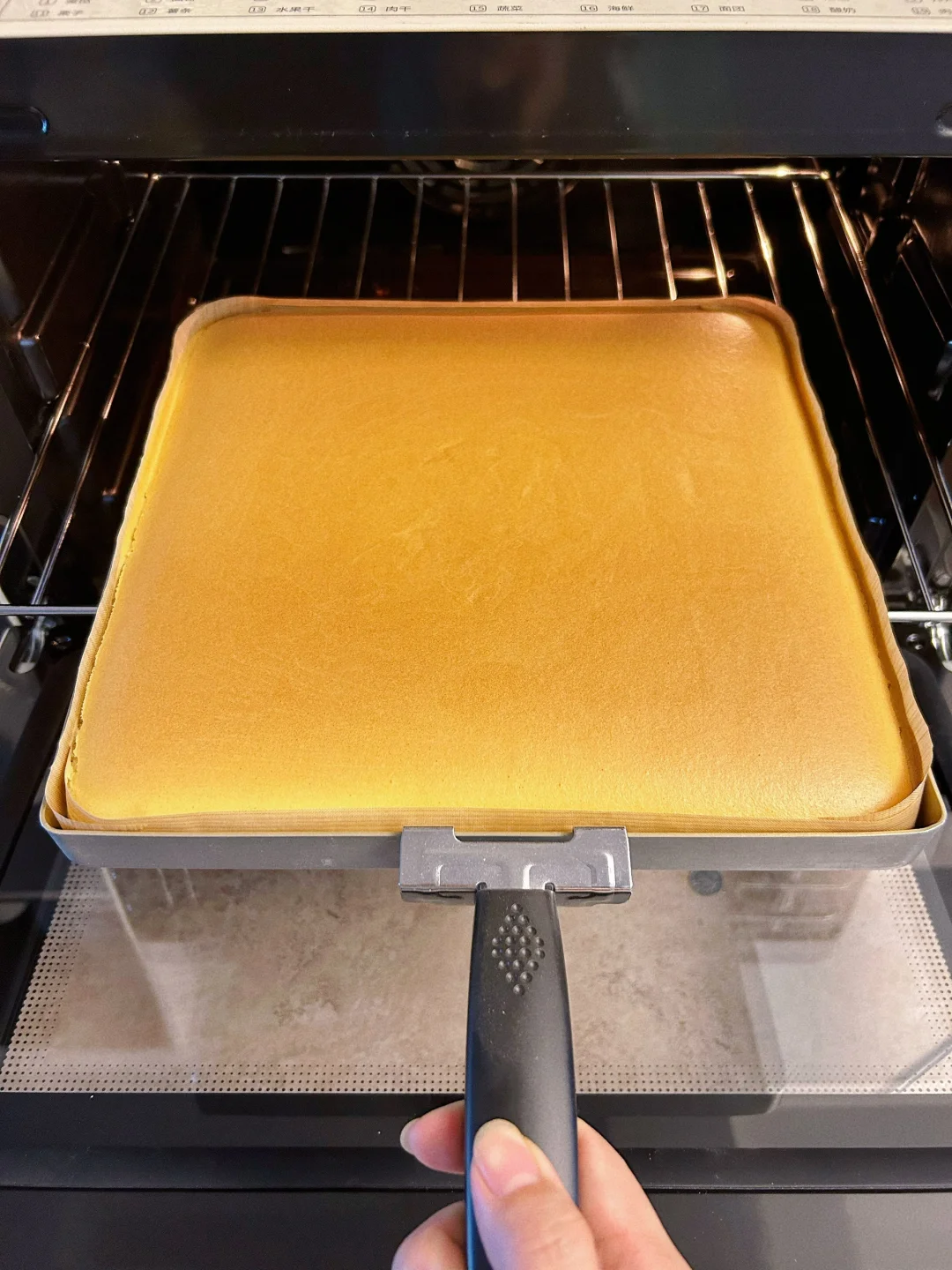 倒入烤盘的面糊是可以堆叠的,不会马上流平,这种面糊状态下做出来的蛋糕卷会很蓬松,很厚实。如果倒入烤盘马上流平了,说明蛋白打发的还不够。