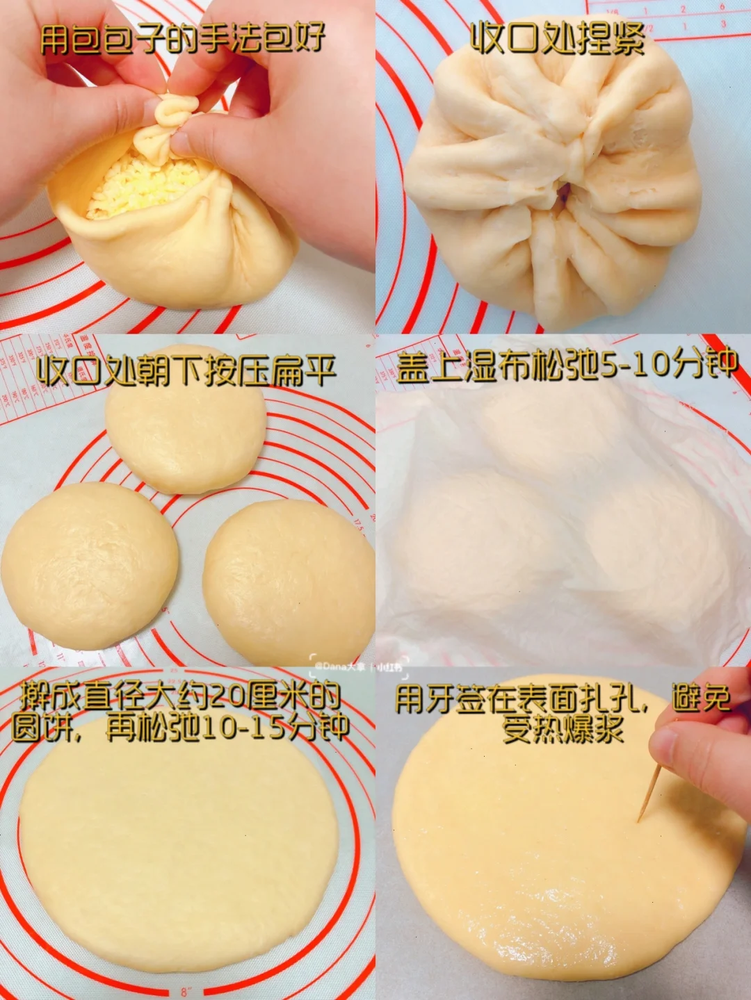 4️⃣松弛好的面团按压扁平,用擀面杖擀成圆形,包入1/3芝士馅,用包包子的手法捏出褶皱收口,盖上湿布松弛5-10分钟。
