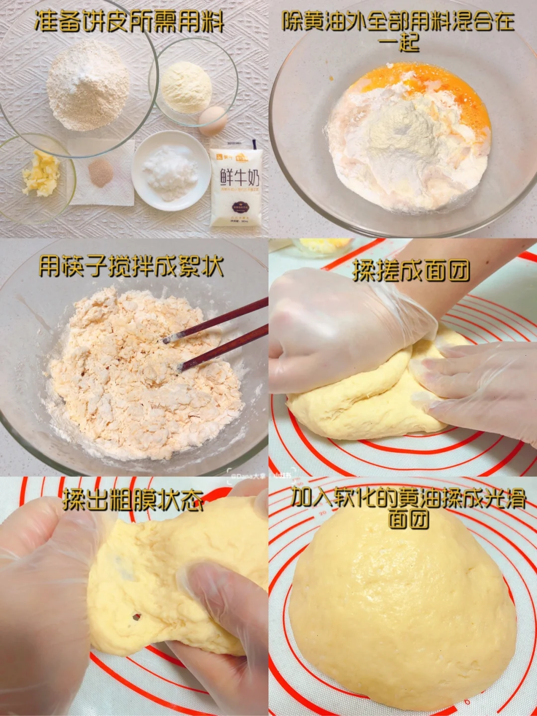 1️⃣将面粉、白砂糖、盐、奶粉、酵母、鸡蛋、牛奶倒在一起混合均匀,揉成粗膜状态的面团,加入提前软化的黄油,揉至表面光滑,醒发30分钟。
