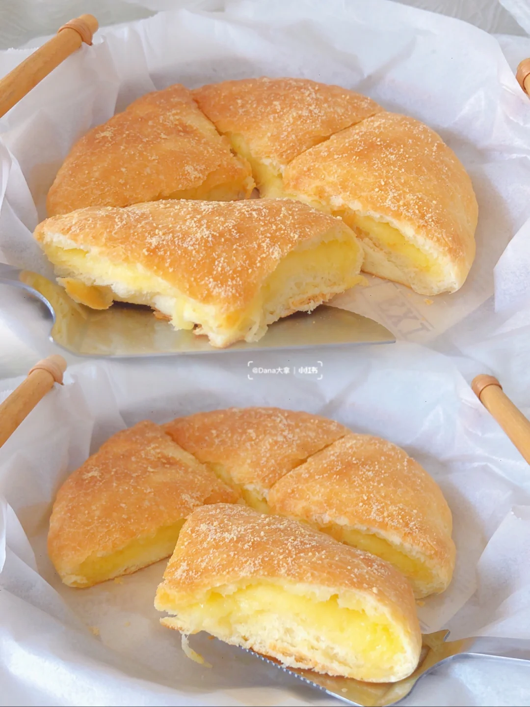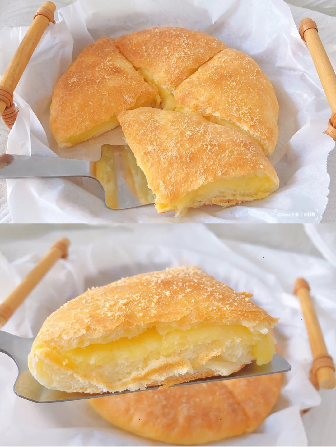 5️⃣将包有芝士馅的面团轻轻压扁,用擀面杖擀成直径大约20cm的圆饼,放在铺有油纸的烤盘上,放在温暖的地方醒发10-15分钟。