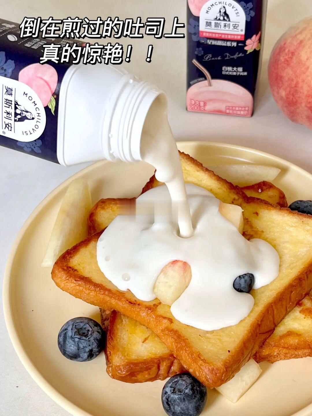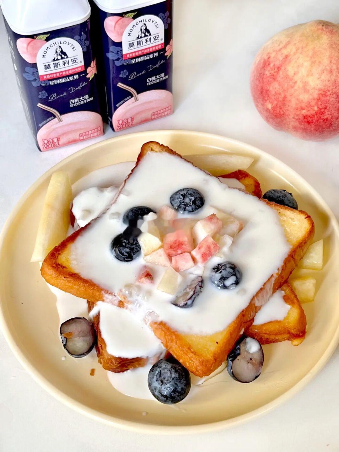 水果酸奶法式吐司外焦里嫩 淋上了白桃大福酸奶真的好清爽!!