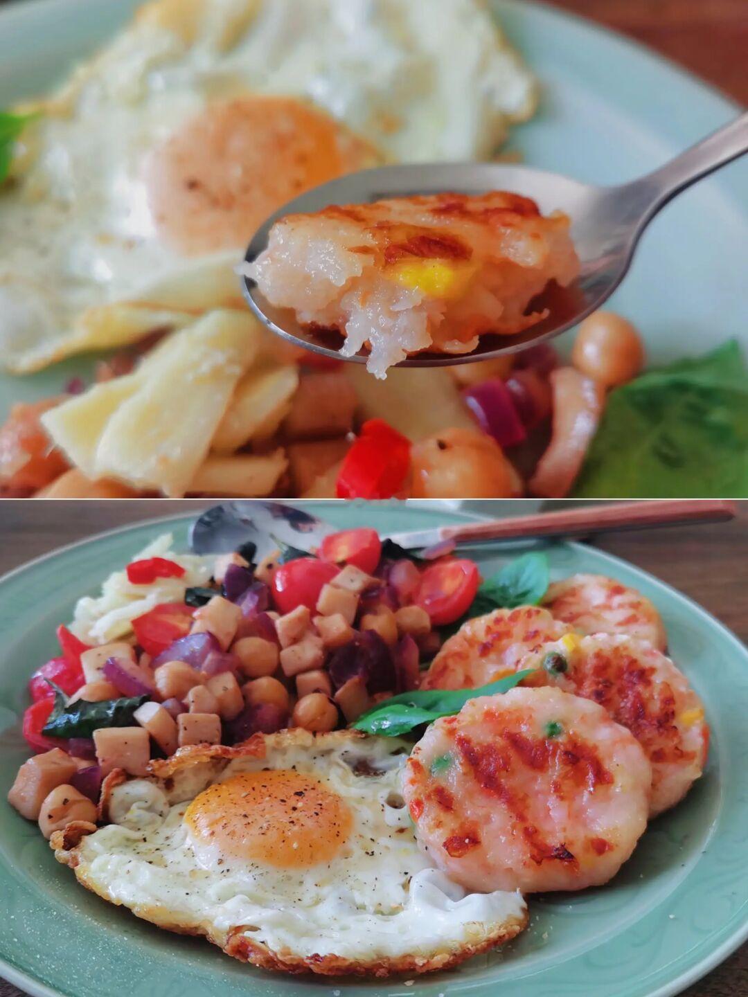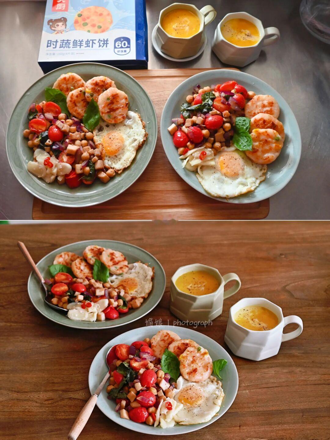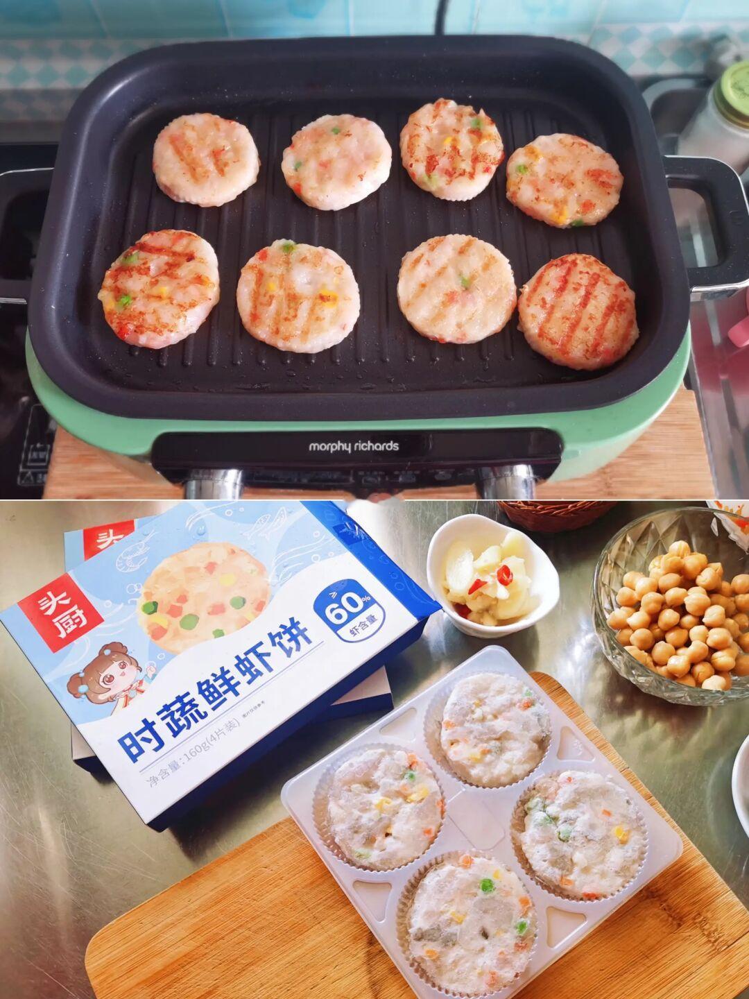 🦐 头厨时蔬鲜虾饼冰箱取出不需要解冻,做早餐方便。入锅煎7--8钟,多翻几次面,两面略微金黄就好。