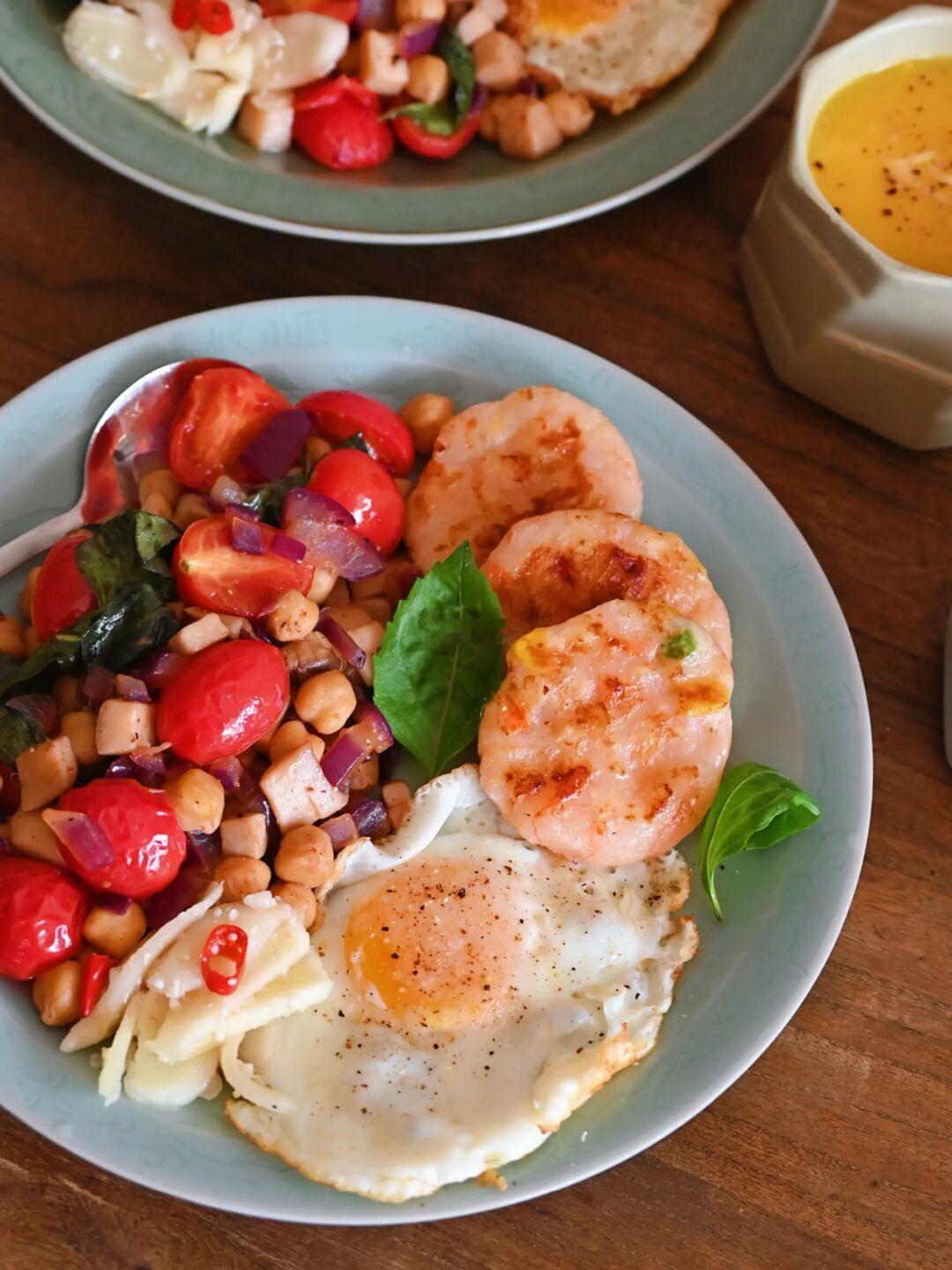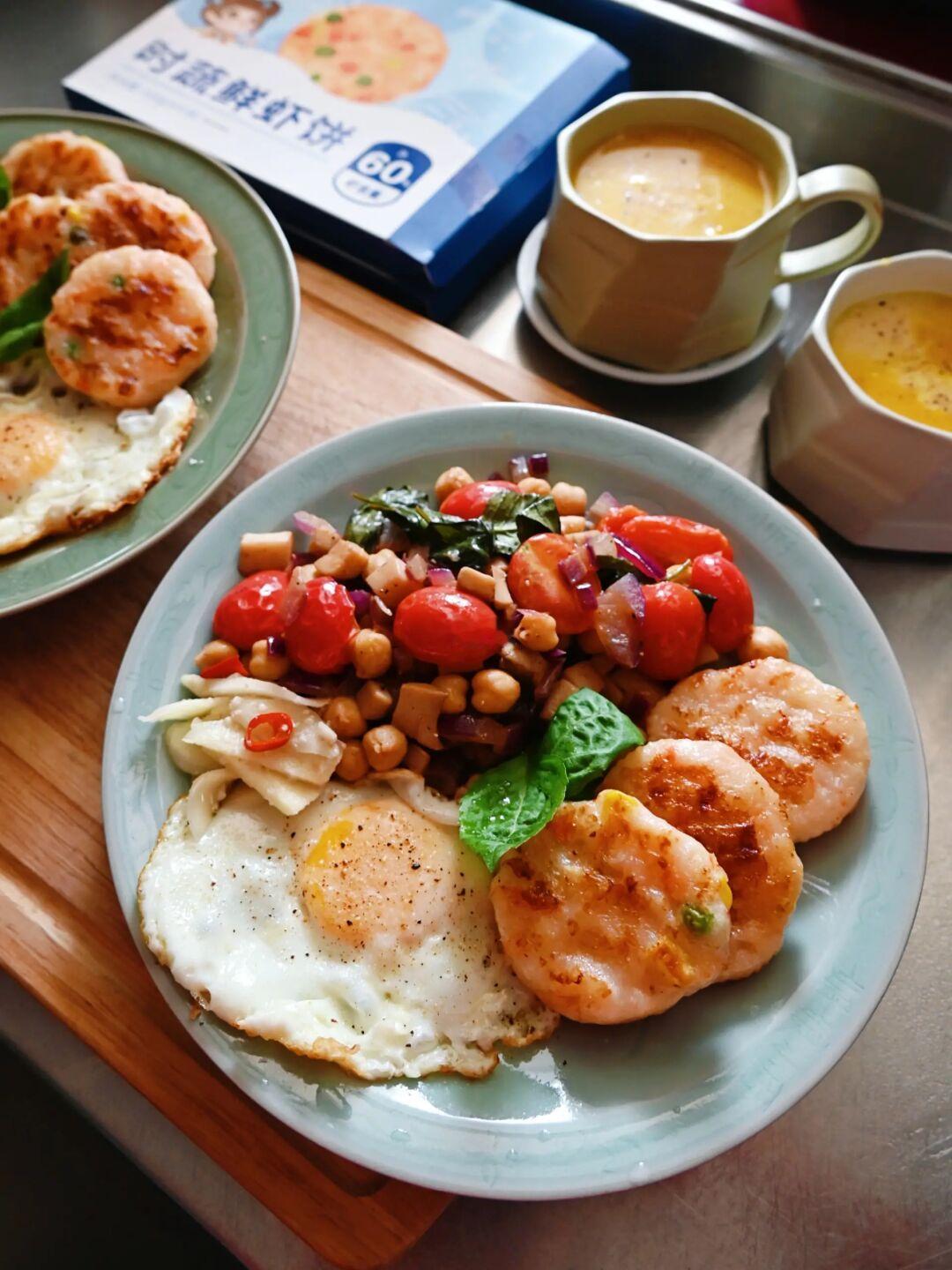 南瓜浓汤/时蔬鲜虾饼/鹰嘴豆热沙拉/煎鸡蛋
