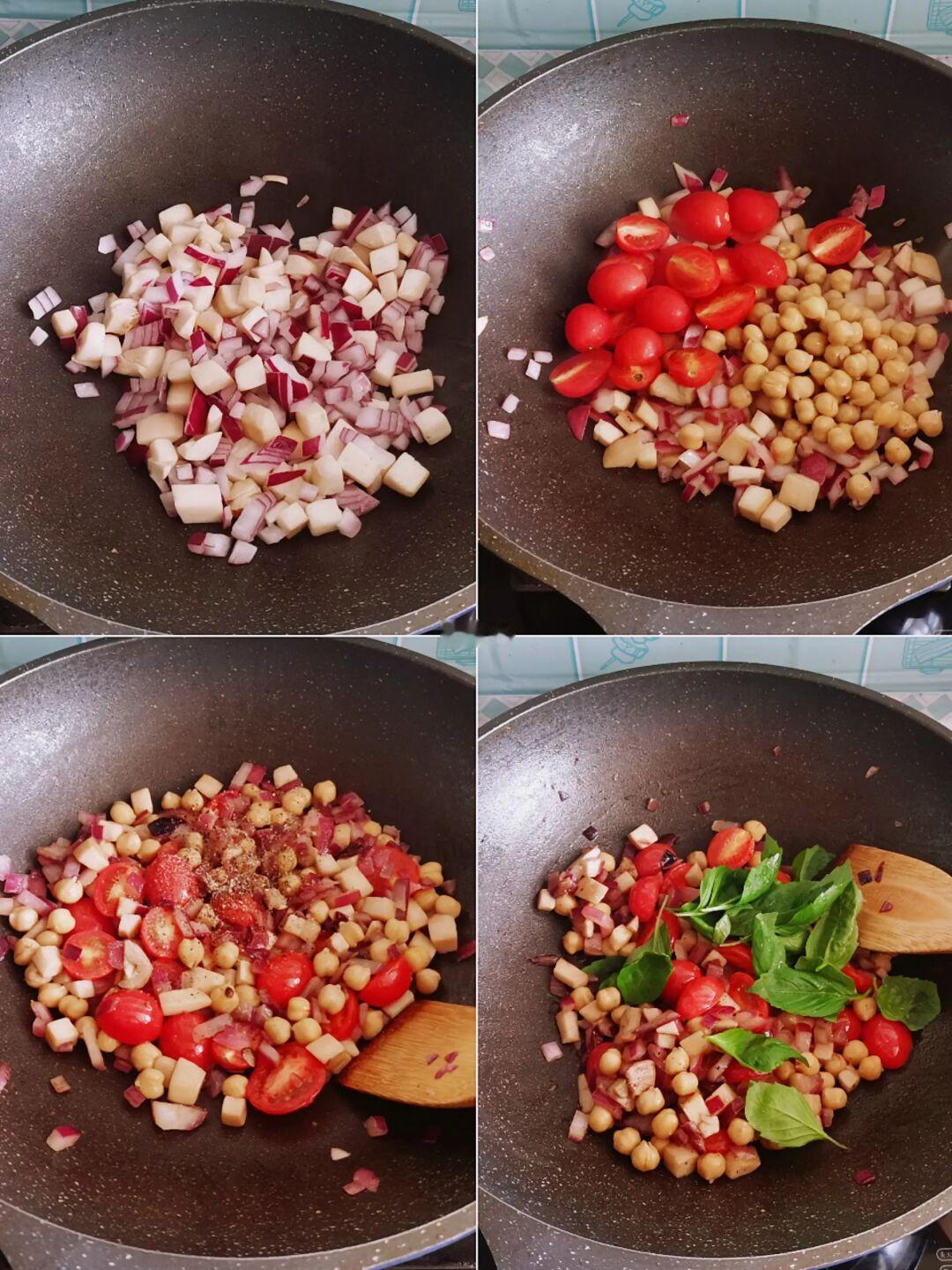 锅加油,温热后加入洋葱丁、杏鲍菇丁炒软出香味,加入小西红柿、鹰嘴豆炒2分钟,再加盐、黑胡椒碎、罗勒叶炒匀就可出锅。