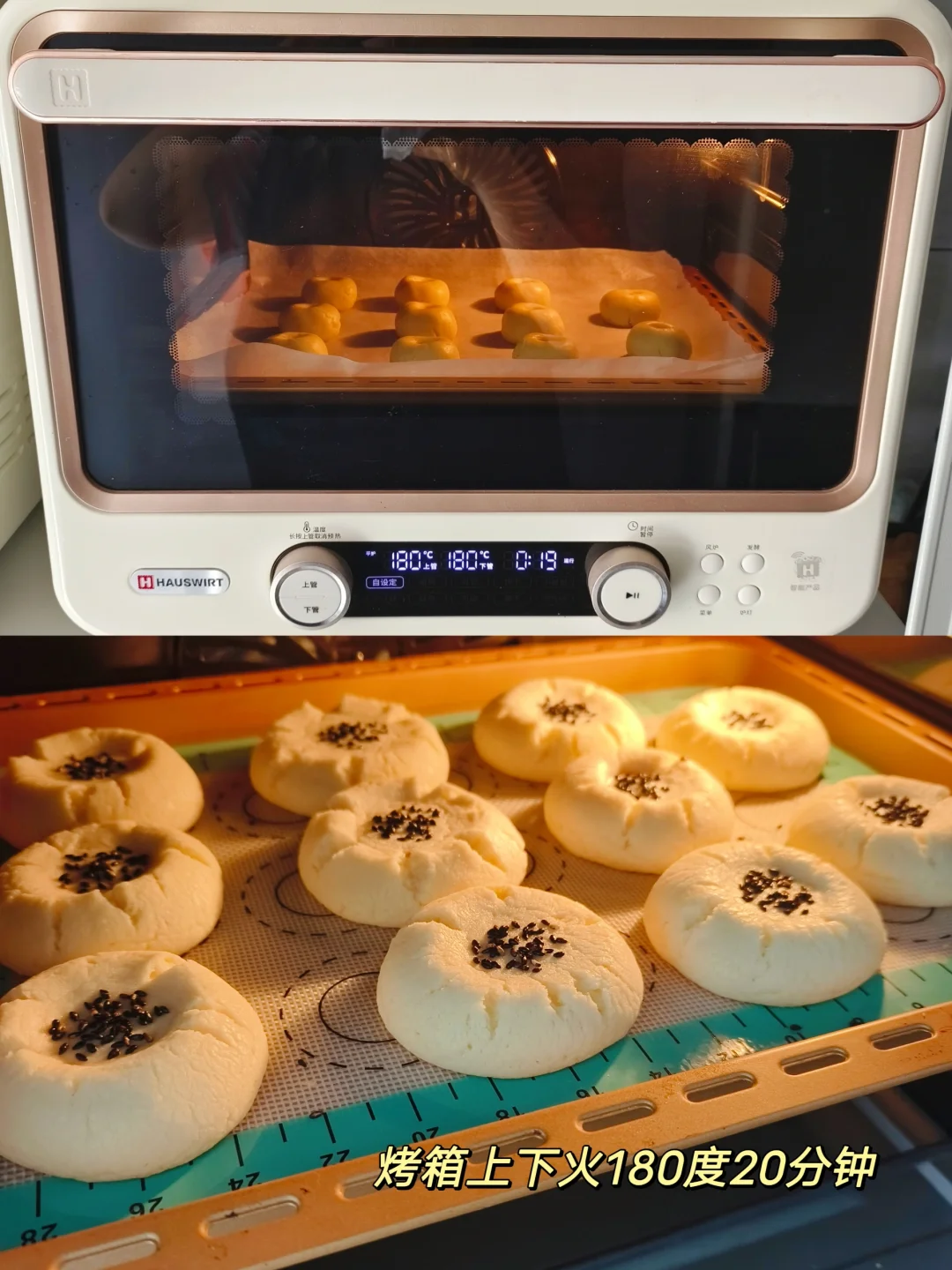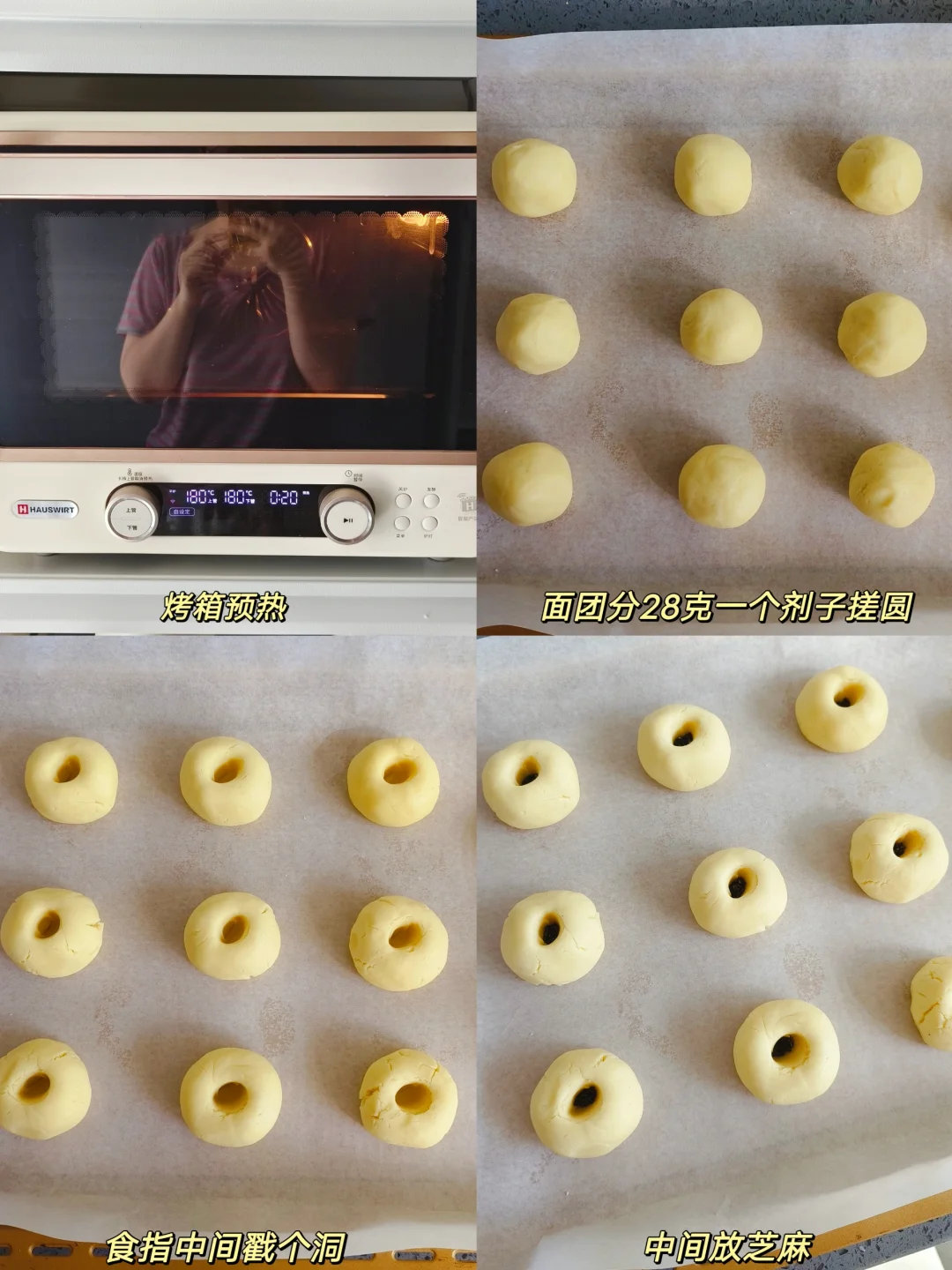 自制的桃酥也太好吃了吧 酥到掉渣,比外面卖的还好吃呢 做法简单,大家都试试哦~ [彩虹R]猪油80克,糖粉70克,蛋液20克,低筋粉145克,小苏打1克,泡打粉3克(此方子可以做11个) [一R]软化的猪油加糖粉打发至蓬松发白质地 [二R]分次加入蛋液搅打均匀 [三R]筛入低筋粉+小苏打+泡打粉揉成团 [四R]每个剂子28克左右,搓圆,中间食指戳个洞,放入黑芝麻,烤箱上下火180度20分钟