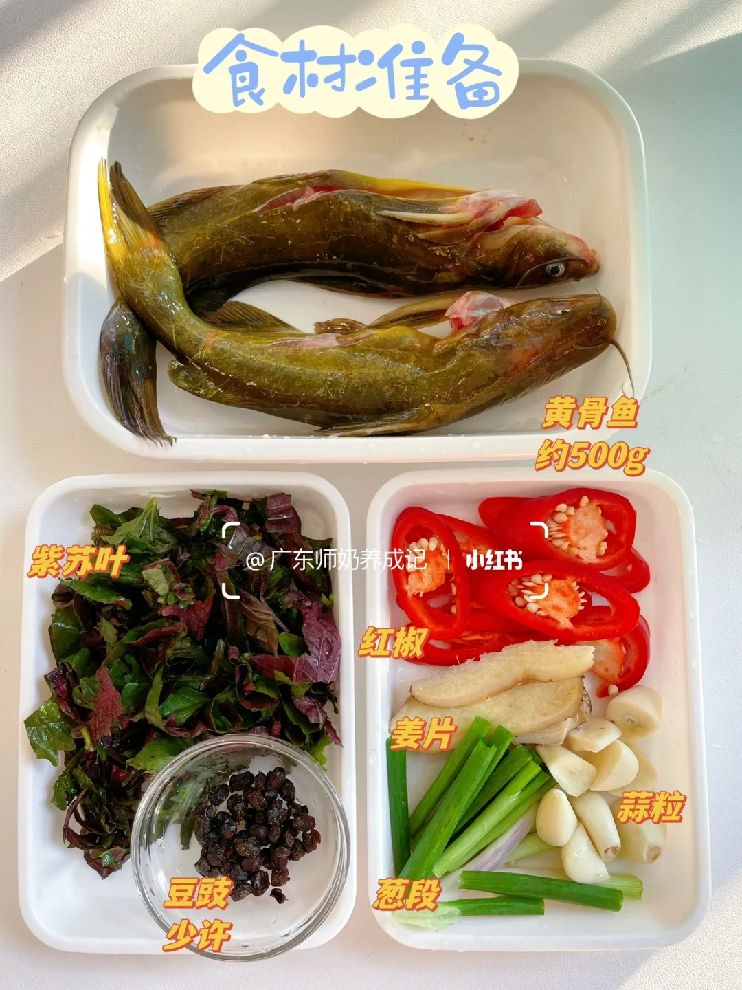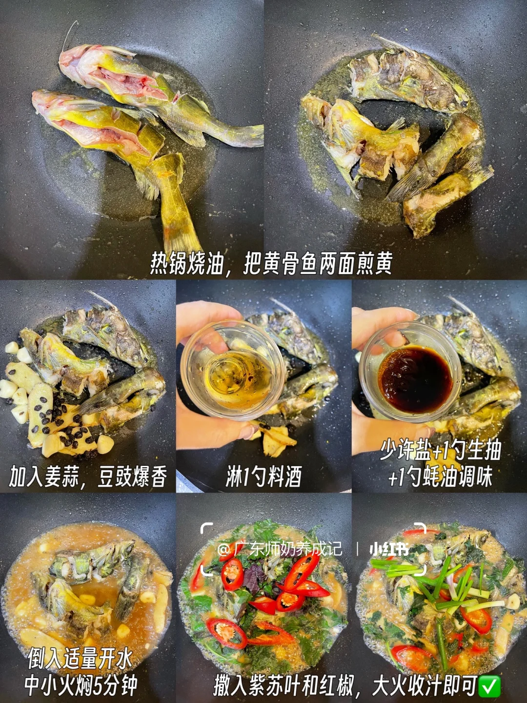 🔥紫苏爱好者看过来,黄骨鱼和紫苏结合,鱼肉吸收了紫苏的香味,简直是神仙搭配,家里的米饭又要遭殃了[捂脸R] 🍳【食材】:黄骨鱼,紫苏,葱姜蒜,豆豉,红椒 👩🍳【做法】: 1⃣️热锅热油,把黄骨鱼两面煎黄后,加入姜蒜,豆豉爆香,参考图片调味 2⃣️加入适量清开水,焖煮5分钟,撒上紫苏和红椒,大火收汁撒入葱段即可✅ 🌟黄骨鱼可以用开水烫一下,刮掉黄色的粘液再做 🌟豆豉偏咸,切勿贪多 🌟我想说紫苏和鱼真的太搭了,谁吃谁知道啊