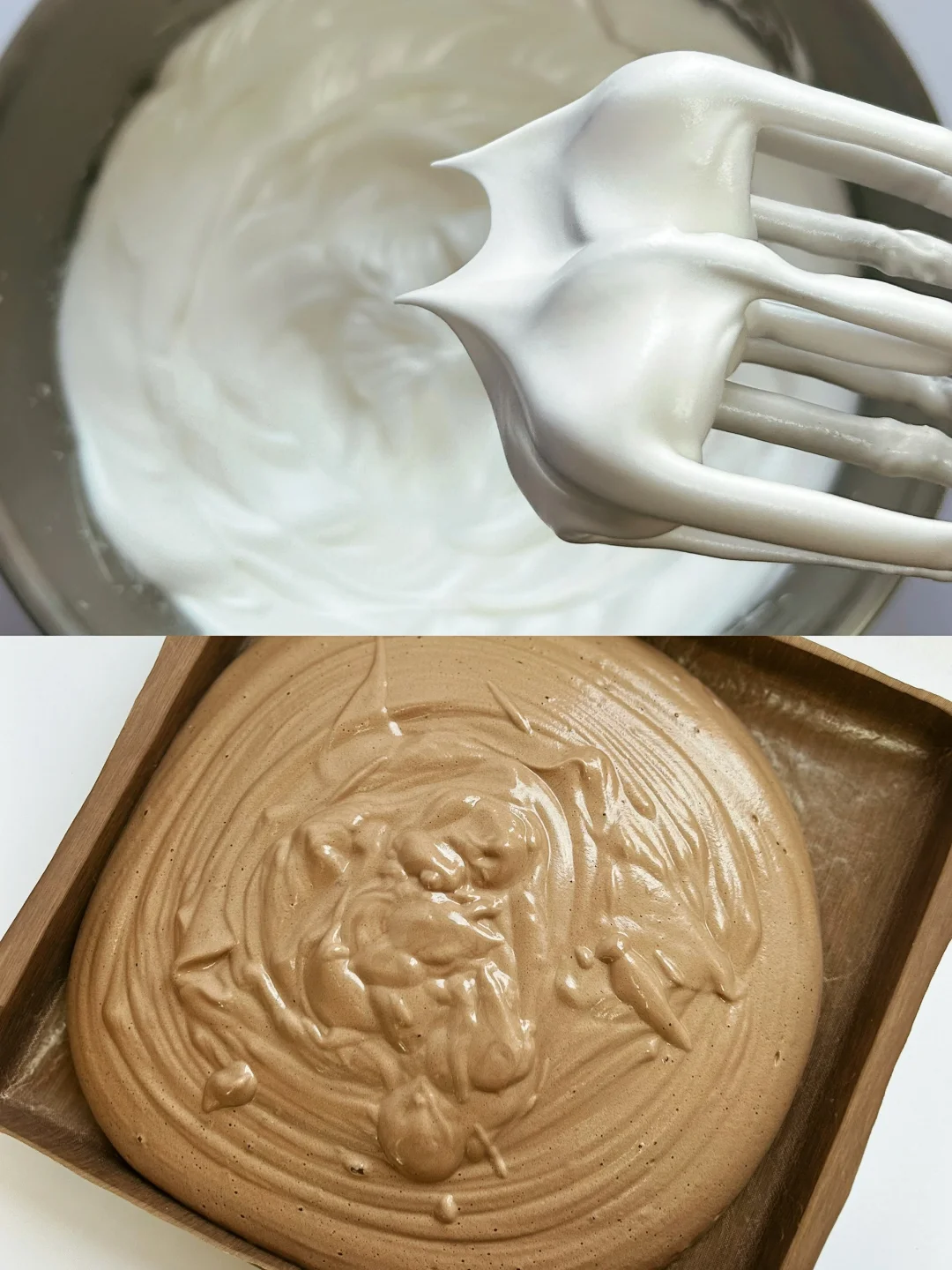 倒入烤盘的面糊是可以堆叠的,不会马上流平,这种面糊状态下做出来的蛋糕卷会很蓬松,很厚实。如果倒入烤盘马上流平了,说明蛋白打发的还不够。
