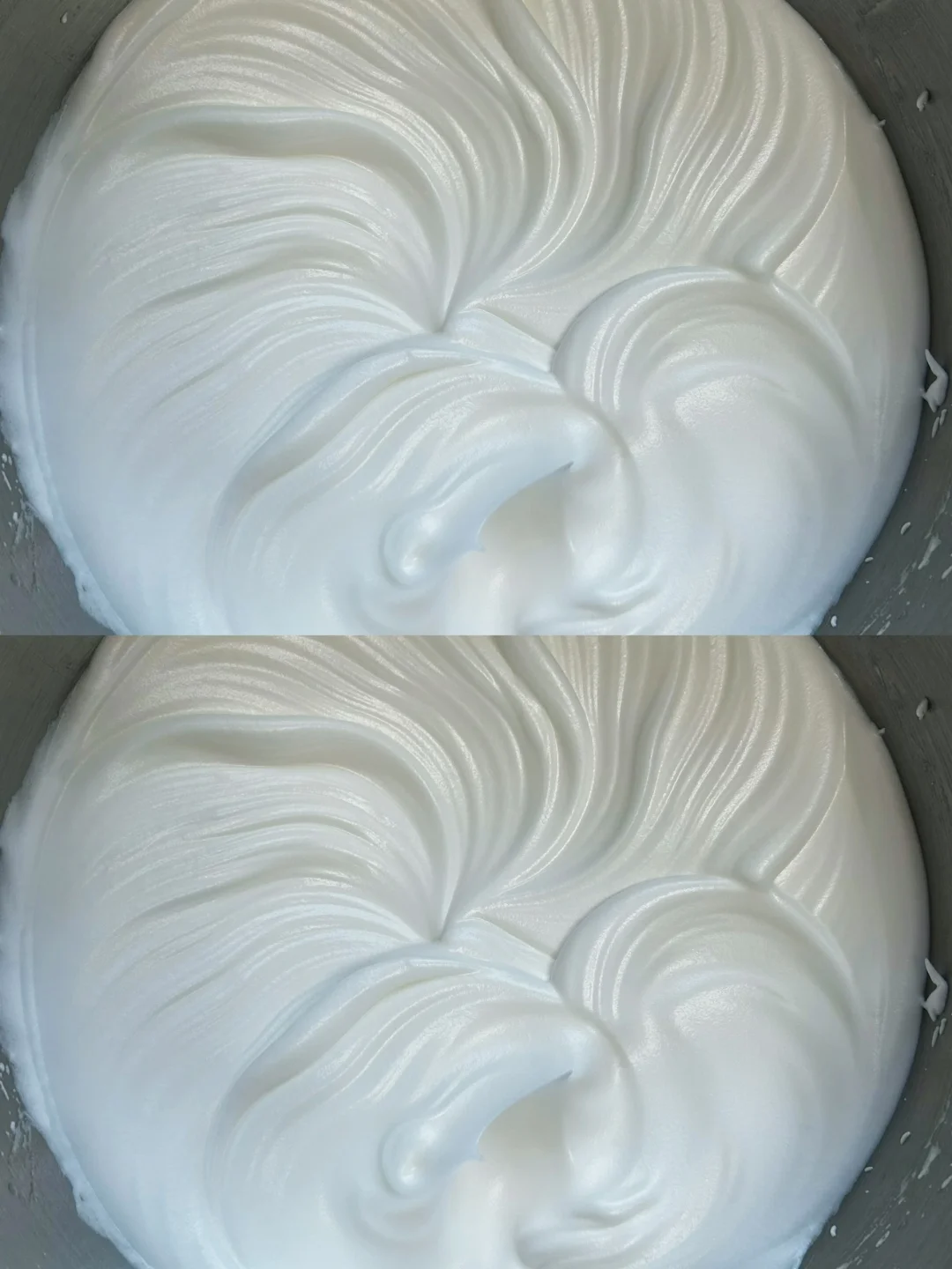 📍打蛋器先开低速打发,然后转高速,打发到有明显纹路时转到低速进行整理,最终打发好的蛋白状态是提起打蛋头能出现小尖角,不要一直追求盆中间的尖角,一定要用打蛋头在盆里的不同位置多检查几次,每个位置都要是小尖角,这样的蛋白霜打发的非常均匀且稳定。