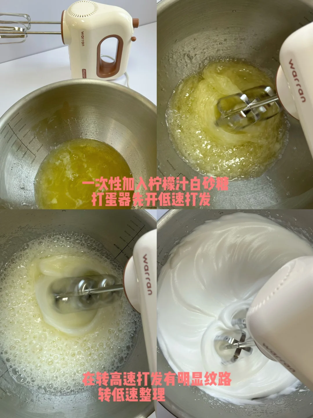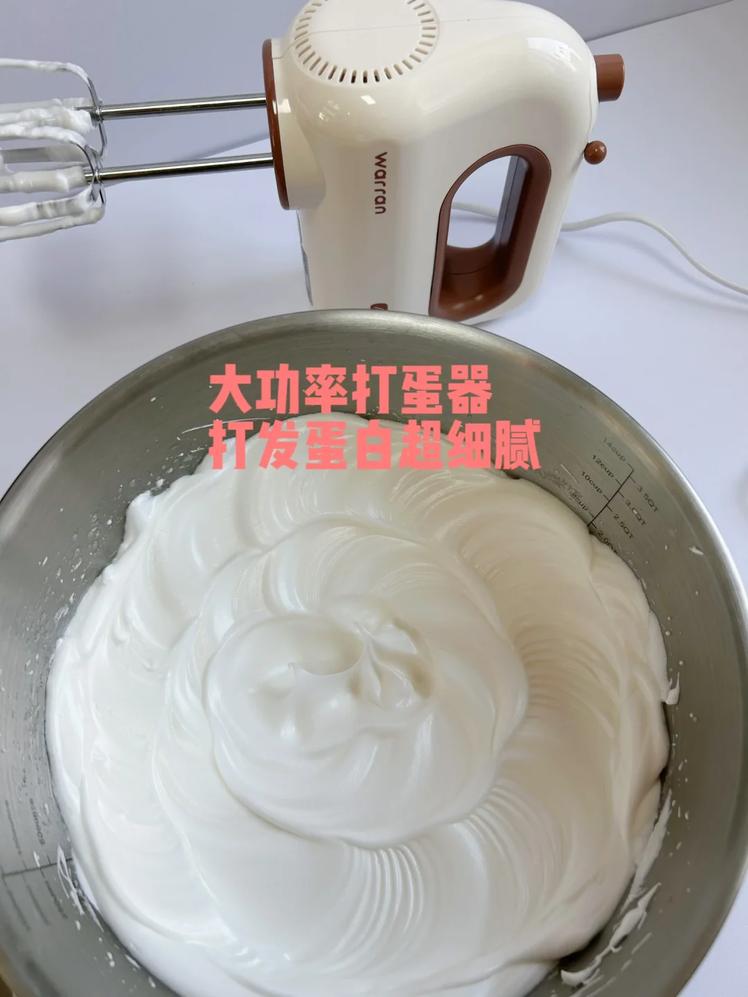 📍打蛋器最好选择功率大一点的,功率小的,打发时间太长,导致蛋白老化粗糙,容易成渣。今天用的是华伦打蛋器,450W大功率,打发蛋白的速度很快,声音也不大,还有led灯,可以更好地观察蛋白的状态,这设计太贴心了🥰