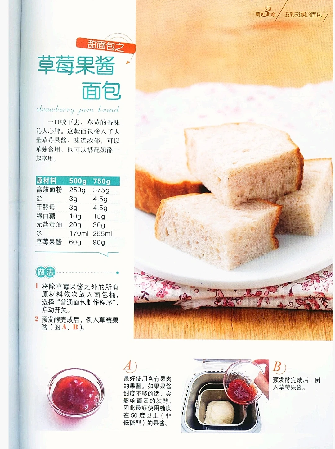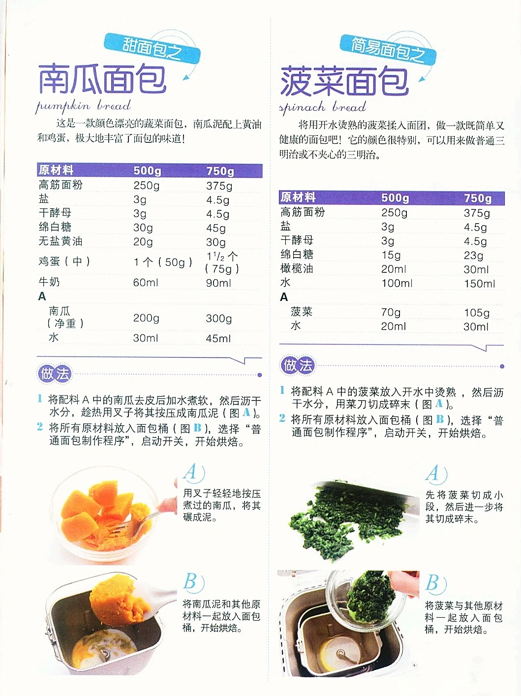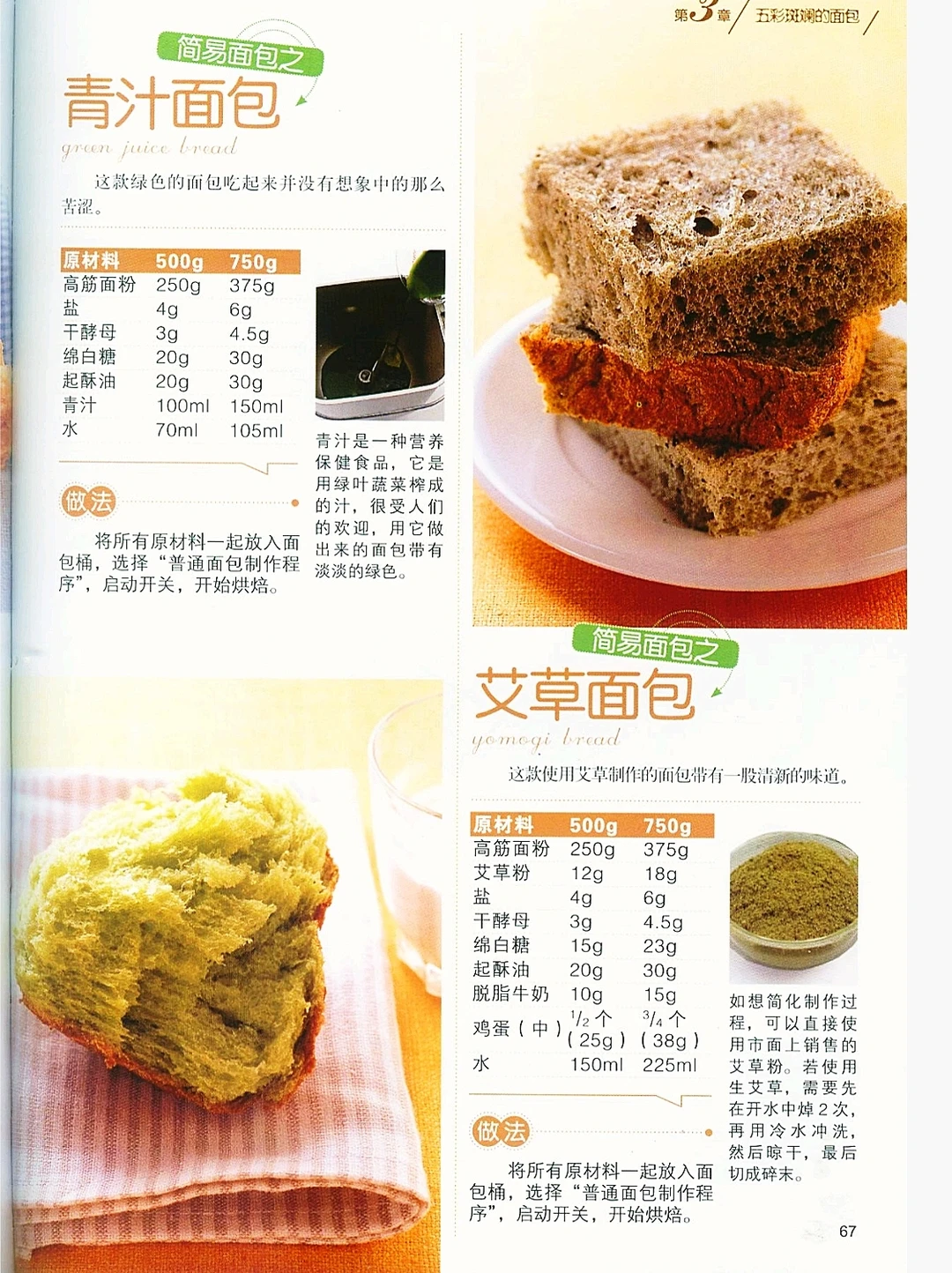 继续分享这本经典面包机教程的馅料吐司合集,如果对白吐司厌倦了,可以尝试翻翻花样。 五彩斑斓的面包既可以使人在视觉上获得满足,也可以使人在味觉上获得新的体验。本章中介绍了健康的蔬菜面包、增强食欲的香料面包以及甜美的牛奶巧克力面包等,并且充分考虑了其中添加的各种配料的性质以及它们之间的营养搭配关系。总之,面团可以多种多样,面包也可以五颜六色,一切都在你的掌握之中