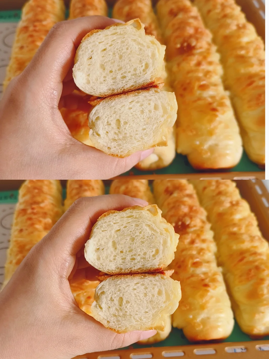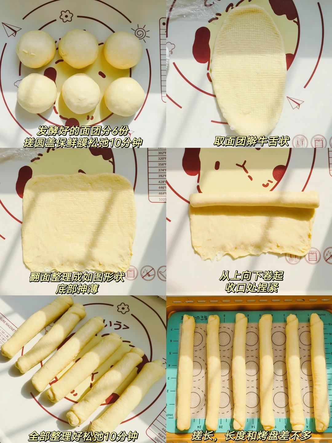 [二R]发酵好的面团分6份,搓圆,盖保鲜膜松弛10分钟,取面团擀牛舌状,翻面,整理长方形,底部抻薄,从上向下卷起,收口处捏紧,全部整理好后,盖保鲜膜继续松弛10分钟,然后搓长,长度和烤盘差不多。