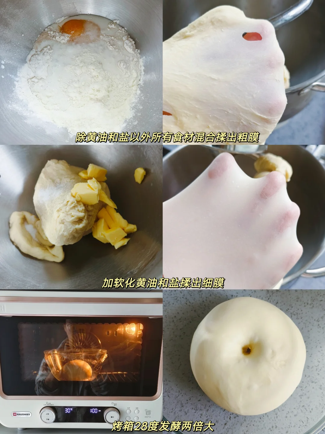 [一R]除黄油和盐以外所有食材混合揉出粗膜,加入软化黄油和盐继续揉出细膜,烤箱28度发酵两倍大。