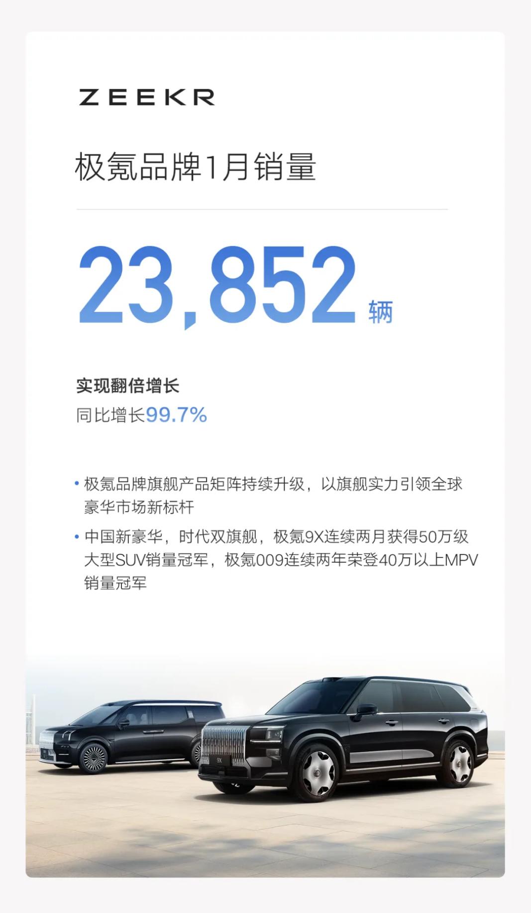从燃油到新能源,从国内到海外,从主流品牌到高端新势力,吉利汽车1月的全面增长,不仅是产品力、技术力的集中体现,更勾勒出其“造每个人的智能精品车”的清晰战略图景。在车市竞争愈发激烈的2026年,这样的开局无疑为吉利全年发展奠定了坚实基础。