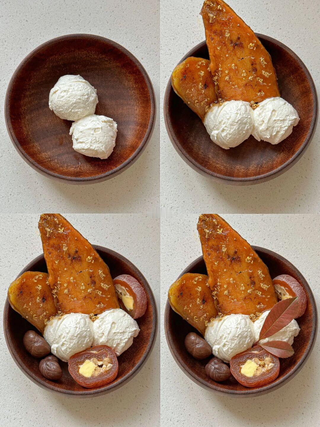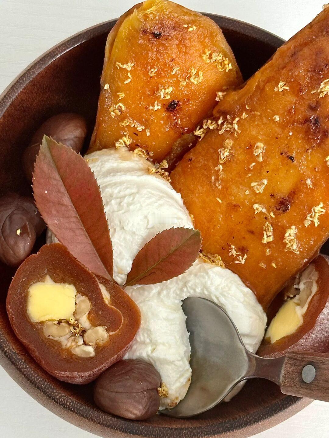 用昨天做的柿饼子做个hen🔥滴酸奶碗🥣 黄油柿饼的做法在上一篇[害羞R] [购物车R]食材 无糖酸奶|焦糖烤红薯|黄油奶酪柿饼|板栗|桂花蜂蜜 🧑🍳步骤 1⃣️无糖酸奶提前过滤一下备用。 2⃣️红薯煮熟,中间切开,撒砂糖,勺子加热融化砂糖,出现焦糖色,抹上桂花蜜 3⃣️碗中放酸奶球,红薯,板栗,柿饼,放片树叶装饰