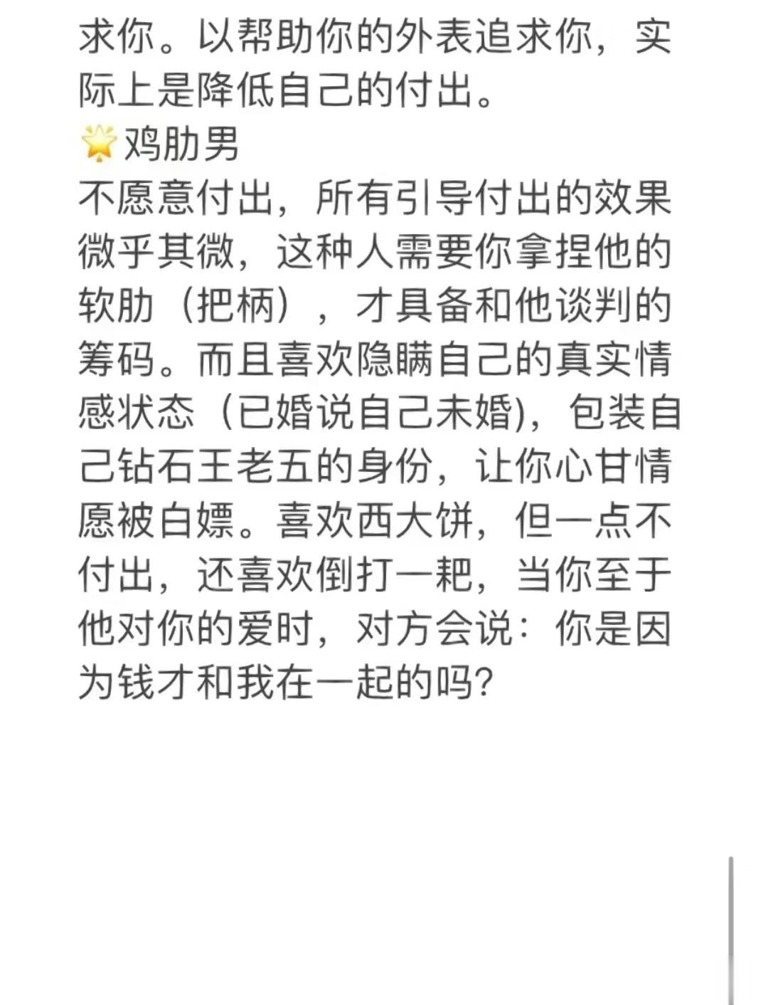鸡肋男现在越来越多,又抠门又捞,画大饼,喜欢夸夸其谈,不实际付出,除非他觉得特别划算(女的价值特别高又大方)否则都不会太投入。