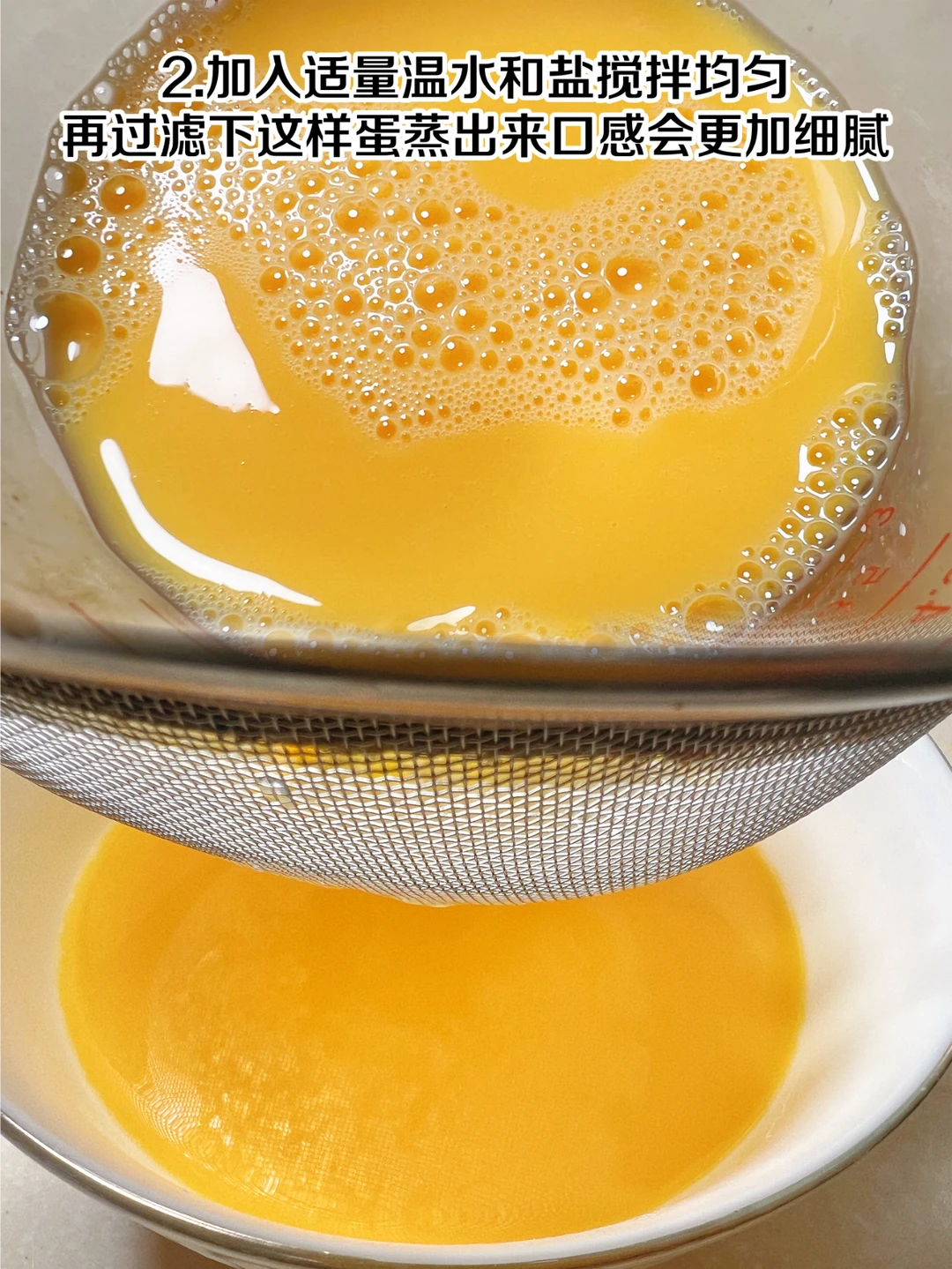 Step 2 :加入适量温水和盐搅拌均匀,再过滤下这样蛋蒸出来口感会更加细腻