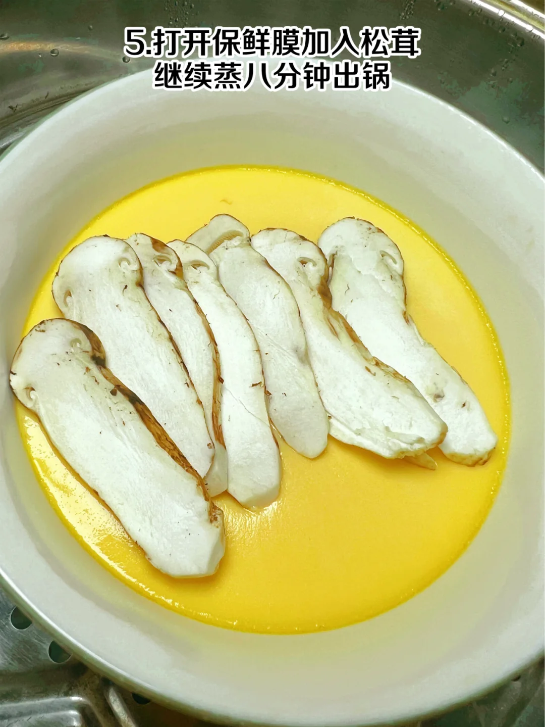 Step 5 :打开保鲜膜加入松茸,继续蒸八分钟出锅