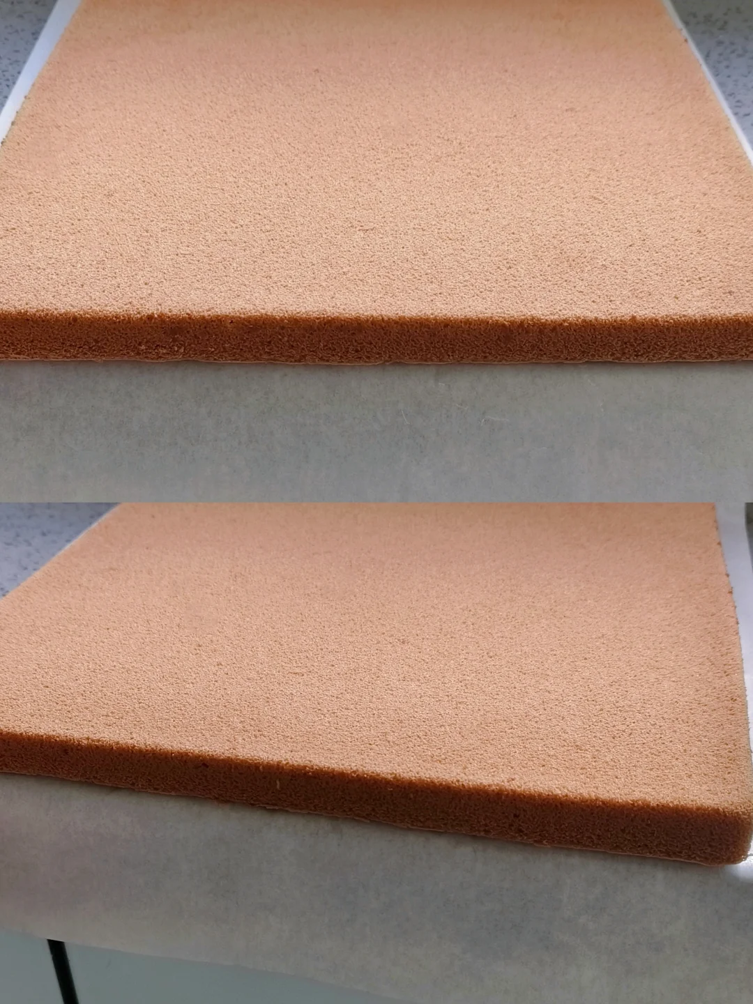 [六R]先将部分蛋白与蛋黄糊翻拌均匀,再将翻拌好的蛋糕糊全部倒入剩余的蛋白里面,翻拌均匀。倒入28*28的烤盘内,整理表面。